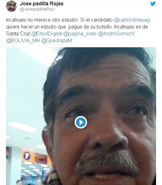 El exsecretario de Minería, Hidrocarburos y Energía de la Gobernación de Santa Cruz, José Padilla, indicó que el campo gasífero está dentro el territorio departamental de Santa Cruz y “no merece otro estudio como solicita el candidato presidencial Carlos Mesa”.Padilla colgó en sus redes sociales su parecer sobre el tema de Incahuasi.Megacampo de gasAcciones: El paquete accionario del megacampo Incahuasi está conformado por Total E&P Bolivie (50%), Gazprom (20%), Tecpetrol (20%) y YPFB Chaco (10%).Búsqueda: En la actualidad se ejecutan 26 pozos exploratorios en 23 áreas, con una inversión superior a los 1.450 millones de dólares.Prioridad: “Nuestra prioridad es la exploración de hidrocarburos, esta actividad nos permitió certificar el año pasado 10,7 TCF (trillones de pies cúbicos)”, dijo ayer, en el acto en Incahuasi, el ministro de Hidrocarburos, Luis Sánchez.Crecimiento: En 2005 la producción de gas en Santa Cruz llegó a 6 MMmcd. Este año la región produce unos 20 MMmcd, según datos oficiales.Santa Cruz Económico