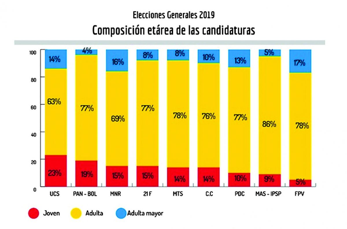 Unidad Cívica Solidaridad (UCS) tiene  el mayor porcentaje de jóvenes en sus listas de candidaturas para la Asamblea Legislativa Plurinacional.  En contraste, el Frente Para la Victoria  (FPV) tiene el menor porcentaje de postulaciones  juveniles, informó Protagonistas.Datos de esa plataforma dan cuenta que del total de candidaturas de  UCS,  el 23% son jóvenes. Ese partido  postula a Víctor Hugo Cárdenas a la presidencia.En el caso del Movimiento Al Socialismo (MAS), el porcentaje llega al 9%, y en Comunidad Ciudadana, al 14%. De todas las fuerzas,  FPV es la    que tiene menor porcentaje de candidaturas jóvenes, con el 5%.Respecto a los anteriores comicios, la presencia de jóvenes en la titularidad de candidaturas ganó terreno. En 2014,  el 39% de los candidatos juveniles estaban  en posición de titularidad. Este año ese porcentaje ascendió a 46%, lo que significa que casi la mitad de los jóvenes inscritos apuntan a cargos titulares.Yerko Rodríguez, coordinador de Juventudes de IDEA Internacional,  afirmó que “la presencia de menores de 28 años de edad en las listas de candidaturas es un dato relevante a considerar, pese al profundo descrédito del sistema de organizaciones políticas”.“Este dato es una evidencia de que existe un grupo potencial de jóvenes, hombres y mujeres, interesados en la práctica de la política partidaria”, subrayó.Rolando Vacaflor, líder de la  Organización de Jóvenes Tarijeños (Ojota),  afirmó que “es necesaria una nueva generación política”“Aparte de que los jóvenes tomaron otra mentalidad de poder incidir en la política, creo que los partidos están generando alternancia de mujeres y jóvenes y eso es muy importante”, afirmó el dirigente.