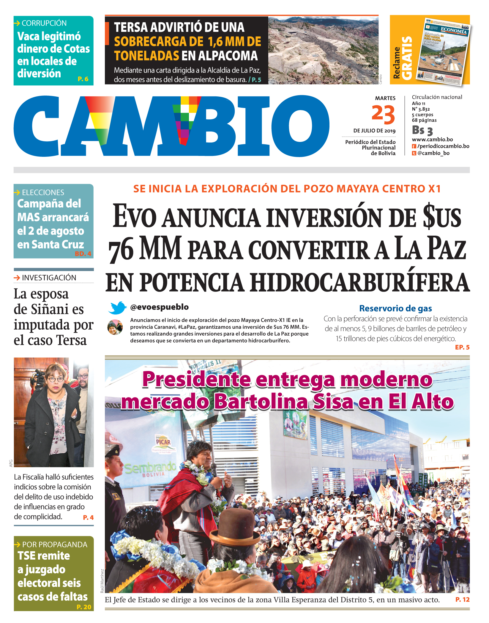 Portadas de periódicos de Bolivia del martes 23 de julio de 2019