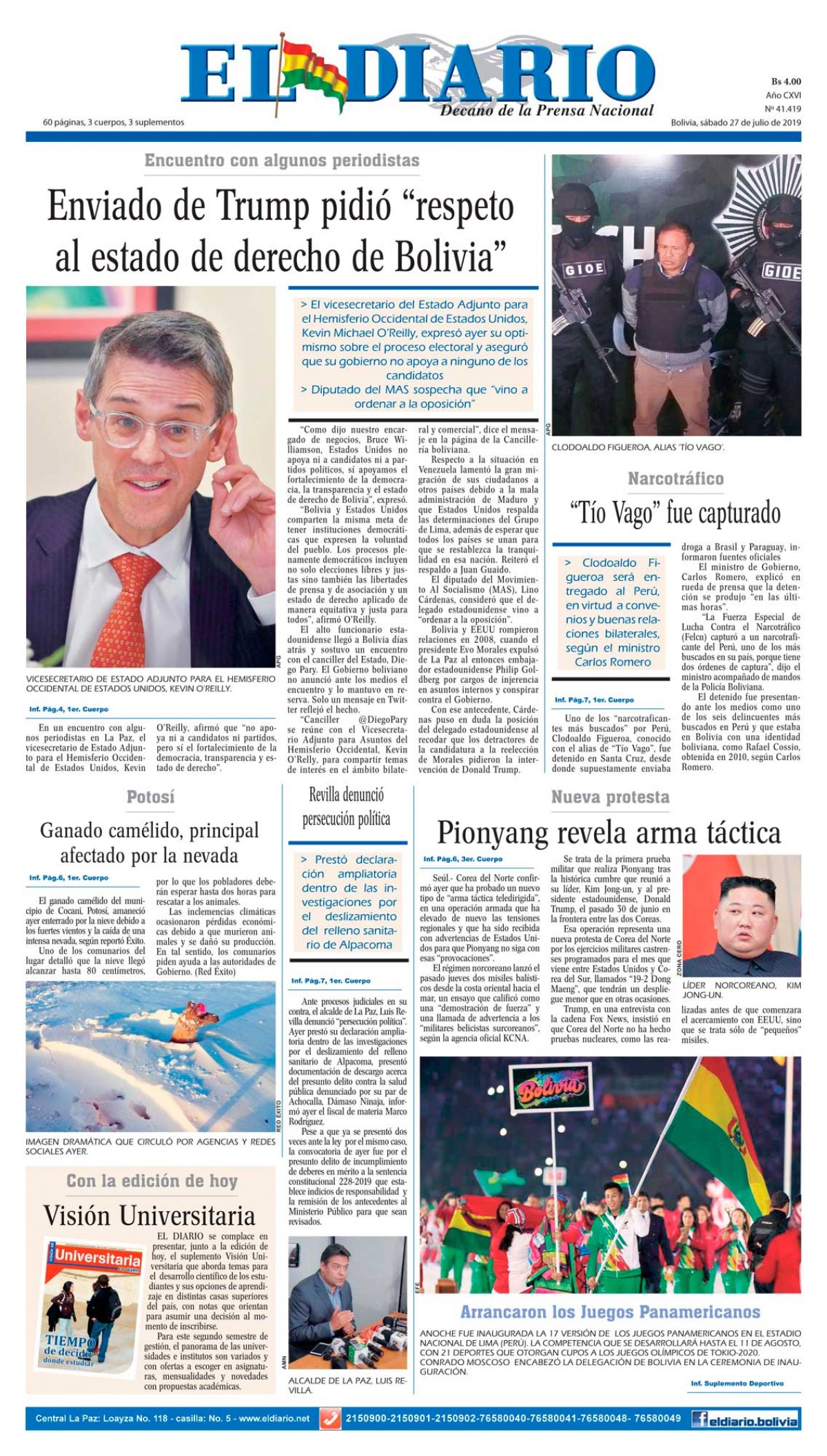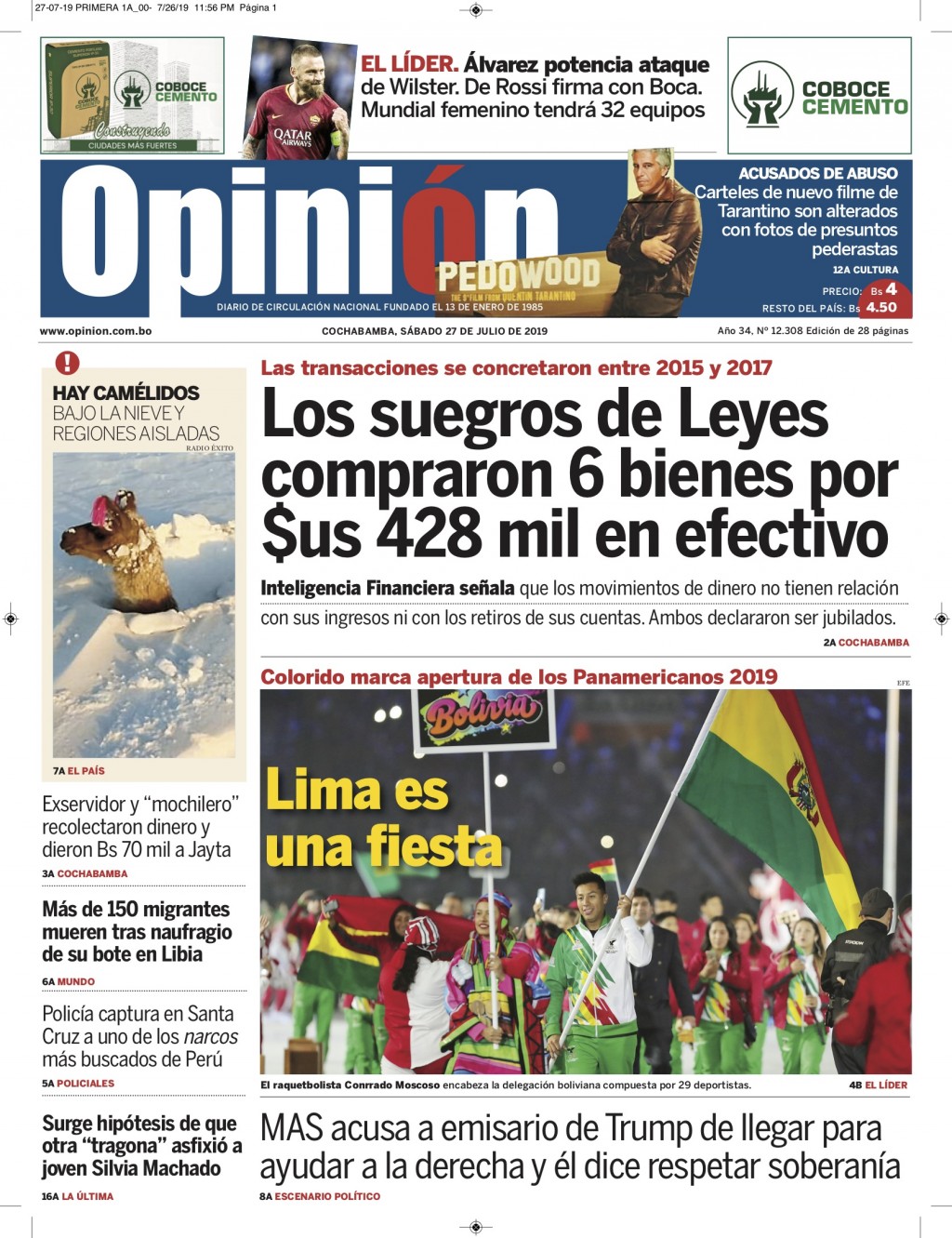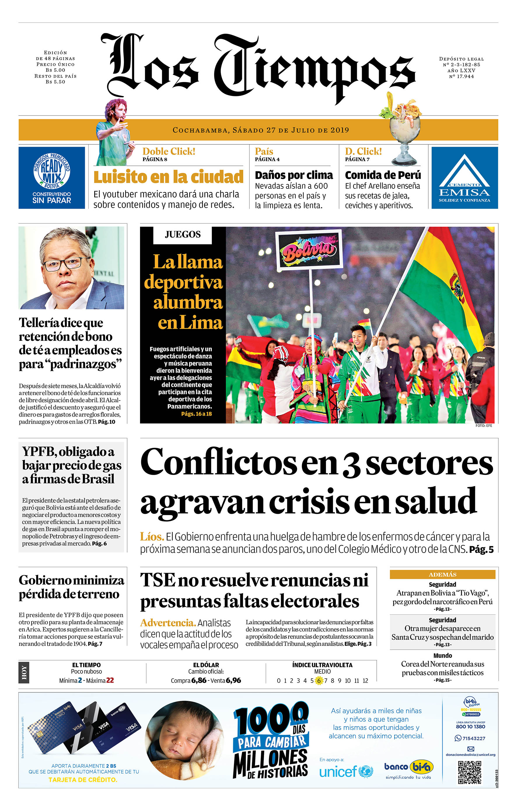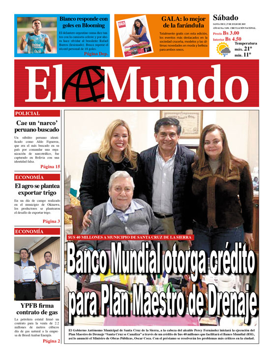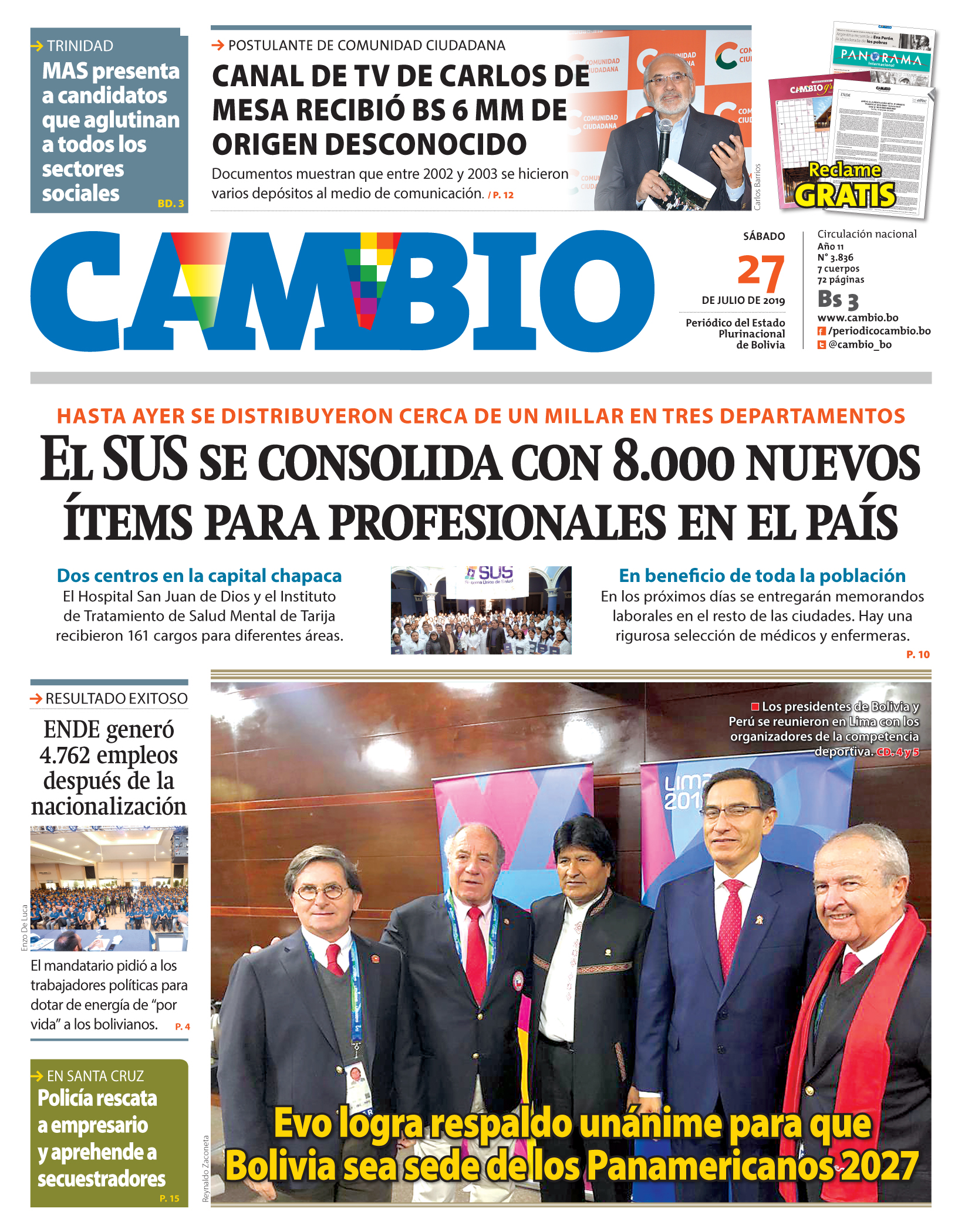 Portadas de periódicos de Bolivia del sábado 27 de julio de 2019Categorías MonitoreoEtiquetas , Portadas de periódicos 27/07/2019 El Deber – Los Tiempos – El Día – La Razón – Cambio – El Diario – Página Siete – Opinión