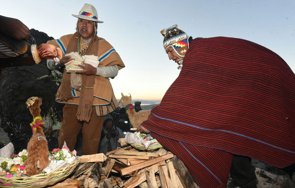 Muy temprano, este jueves, el presidente Evo Morales, el vicepresidente Álvaro García y autoridades del Ejecutivo y del Legislativo ofrecieron a la Pachamama una ceremonia en la cual el Mandatario pidió mejores días para el país.