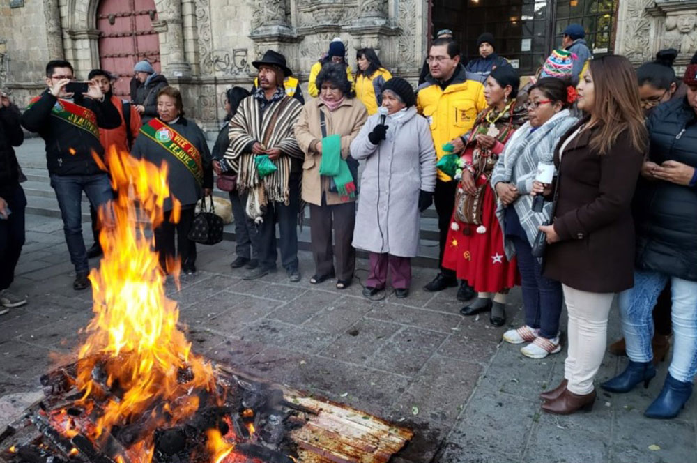 La ofrenda edil fue en el atrio de la Iglesia de San Francisco, en pleno centro paceño, en tanto que el presidente Morales prefirió la loma del cerro Pajchiri, a unos 90 kilómetros de la ciudad de La Paz.