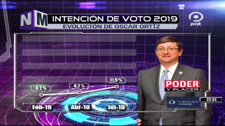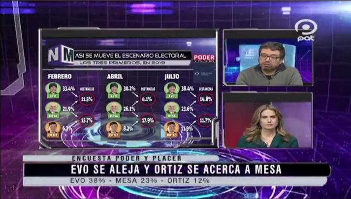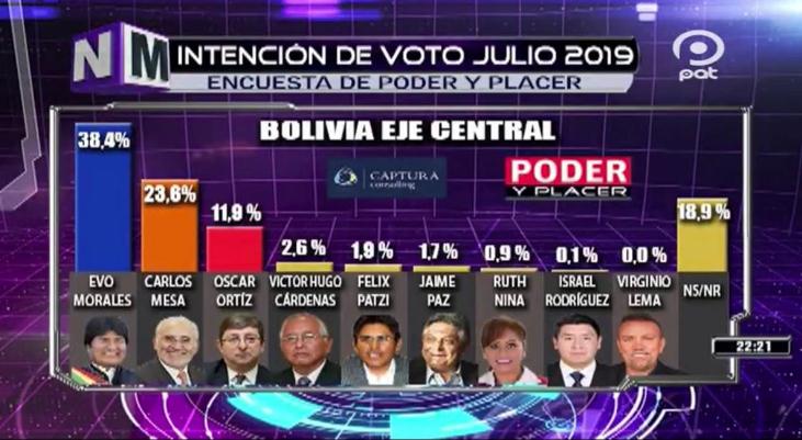 Captura Consulting dio a conocer esta noche en “No Mentirás” un sondeo de intención de voto, realizado del 15 al 29 de julio. En la encuesta se aprecia un crecimiento del candidato de Bolivia Dice No, Oscar Ortiz, que prácticamente duplica su apoyo desde la muestra de febrero, pasando a un 11,9%. Se confirma también la tendencia decreciente de Carlos Mesa, de Comunidad Ciudadana, quien baja al 23,6%. Por su parte, el presidente Evo Morales, quien postula por el MAS desconociendo el referéndum del 21F, asciende a un 38,4%.