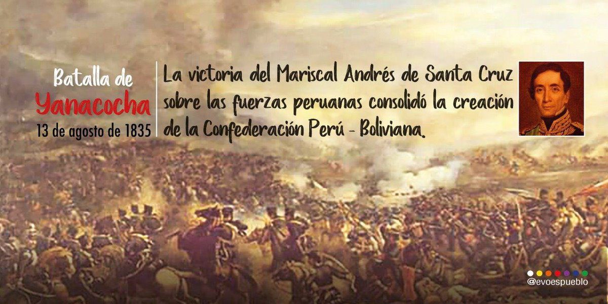 Como hoy, 1835, el Mariscal Andrés de Santa Cruz, al mando del ejército unido, derrotó a las tropas de Agustín Gamarra en la laguna de Yanacocha. Con esa victoria consolidó la Confederación Perú-Boliviana, sueño que después fue frustrado por las oligarquías. https://t.co/8Waz8Y4tiC