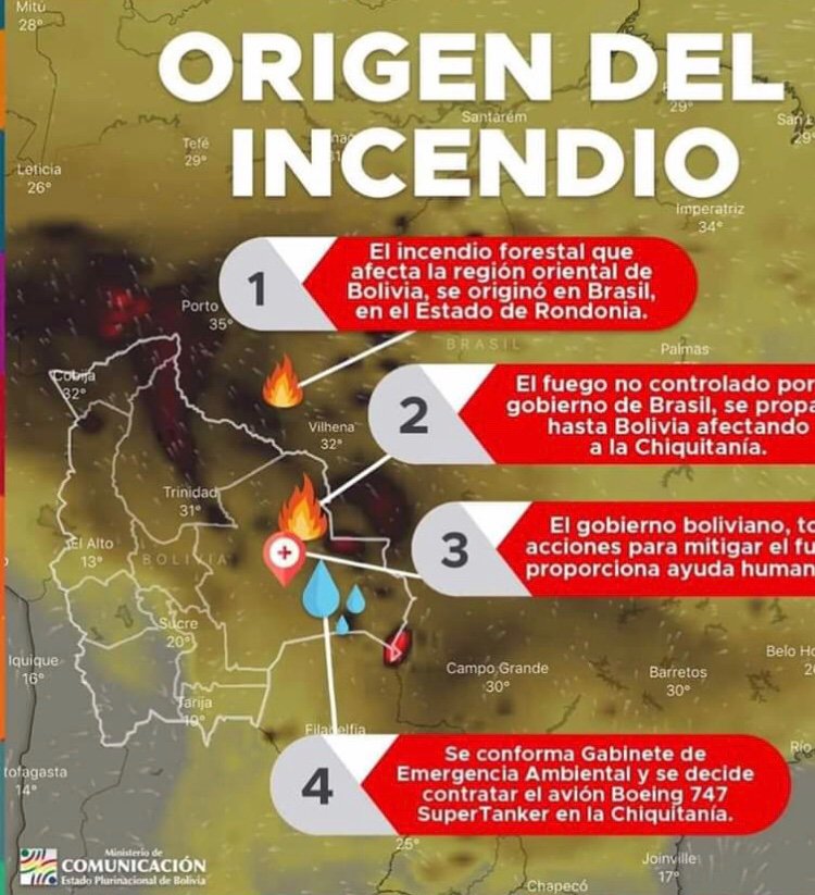 Esta caricatura del Ministerio de Comunicación esta rondando en las redes. Creen que somos imbeciles! El fuego paso de Brasil a SC sin tocar el Beni? Llego a la frontera con Paraguay desde ahí? Que manera de ser alcahuetes! @CFValverde @MonicaAparicioA @JulioAliagaL @AndrsGomezV https://t.co/E9LEjaHQRj