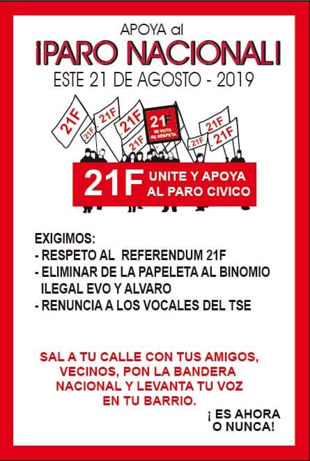 Este 21 de agosto, debemos promover el Paro Nacional contra el TSE azul, el prevaricato del TCP, la sumisión del TSE al inscribir al binomio trucho y la defensa del voto popular del 21F.Elecciones fraudulentas, ¡no! ¡Viva el 21F!@diarioeldeber@pagina_siete@LosTiemposBol@ANF https://t.co/0xKey76qS2