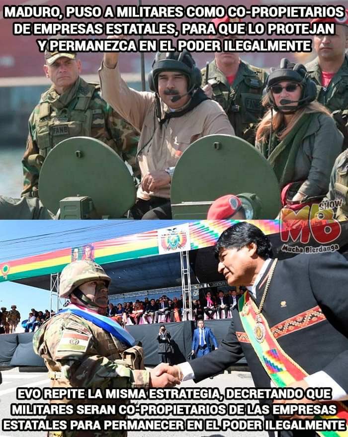 ¡GobMAS busca corromper jefes y oficiales de las FFAA de Bolivia!Involucrarles en la gestión de empresas públicas es cooptar y envilecer la lealtad militar al Capitán Gral, al gob y al país.¿Lo permitirán los militares dignos? https://t.co/ivpiepValh