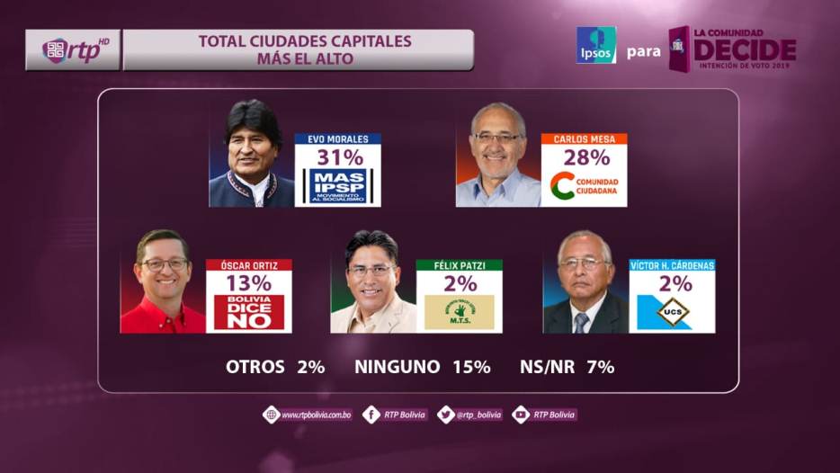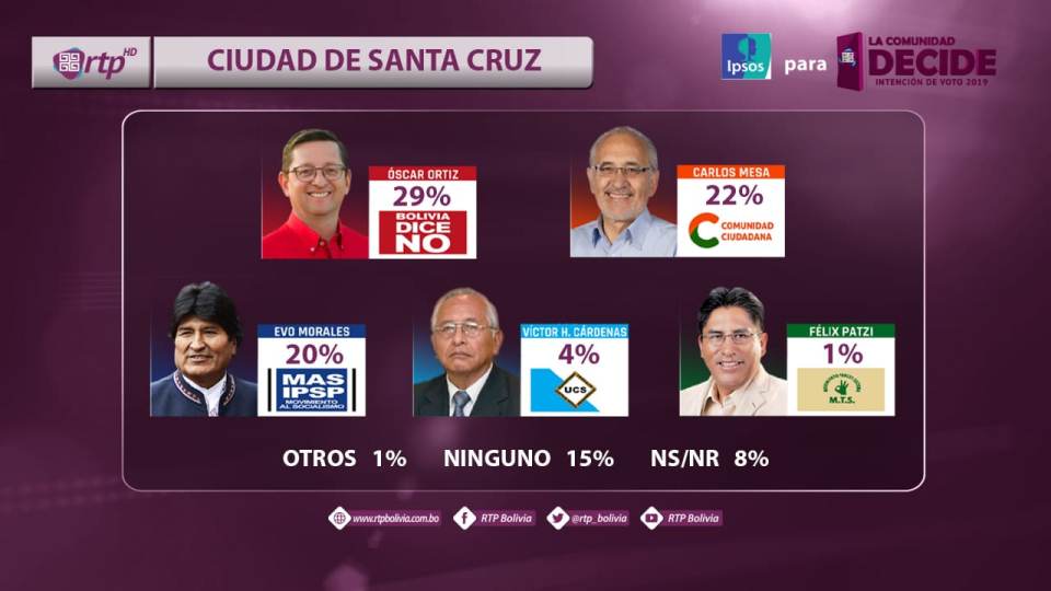 La encuestadora Ipsos dio a conocer hoy una nueva encuesta en el programa La Comunidad Decide, difundido por RTP en alianza con los diarios El Día, Opinión y La Razón. Con un margen de error del 2,19%, el sondeo realizado del 1 al 13 de agosto en las nueve capitales departamentales más El Alto arrojó el siguiente resultado nacional de intención de voto:31% MAS28% CC13% BDN2% MTS2% UCSEn la ciudad de Santa Cruz:29% BDN22% CC20% MASEn la ciudad de Trinidad se registra un triple empate:22% CC20% MAS18% BDNVea resultado en las 10 ciudades:Encuesta Ipsos: Evo lleva solo tres puntos de ventaja a Mesa en las 10 grandes ciudades de Bolivia mmmm