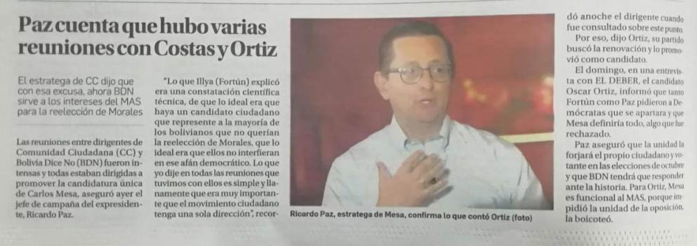 El jefe de campaña de Comunidad Ciudadana confirmó que en las reuniones mantenidas el año pasado con Oscar Ortiz y Rubén Costas el grupo de Carlos Mesa se negó a construir una alianza de unidad con Demócratas, señalando que “lo ideal era que haya un candidato ciudadano (…) lo ideal era que ellos no interfieran en ese afán democrático”.“Lo que yo dije en todas las reuniones que tuvimos con ellos es simple y llanamente que era muy importante que el movimiento ciudadano tenga una sola dirección”, dijo Paz Ballivián, confirmando lo indicado ayer por Ortiz en una entrevista del mismo diario, donde remarcó la funcionalidad de Mesa con el MAS por impedir la articulación de la unidad opositora.