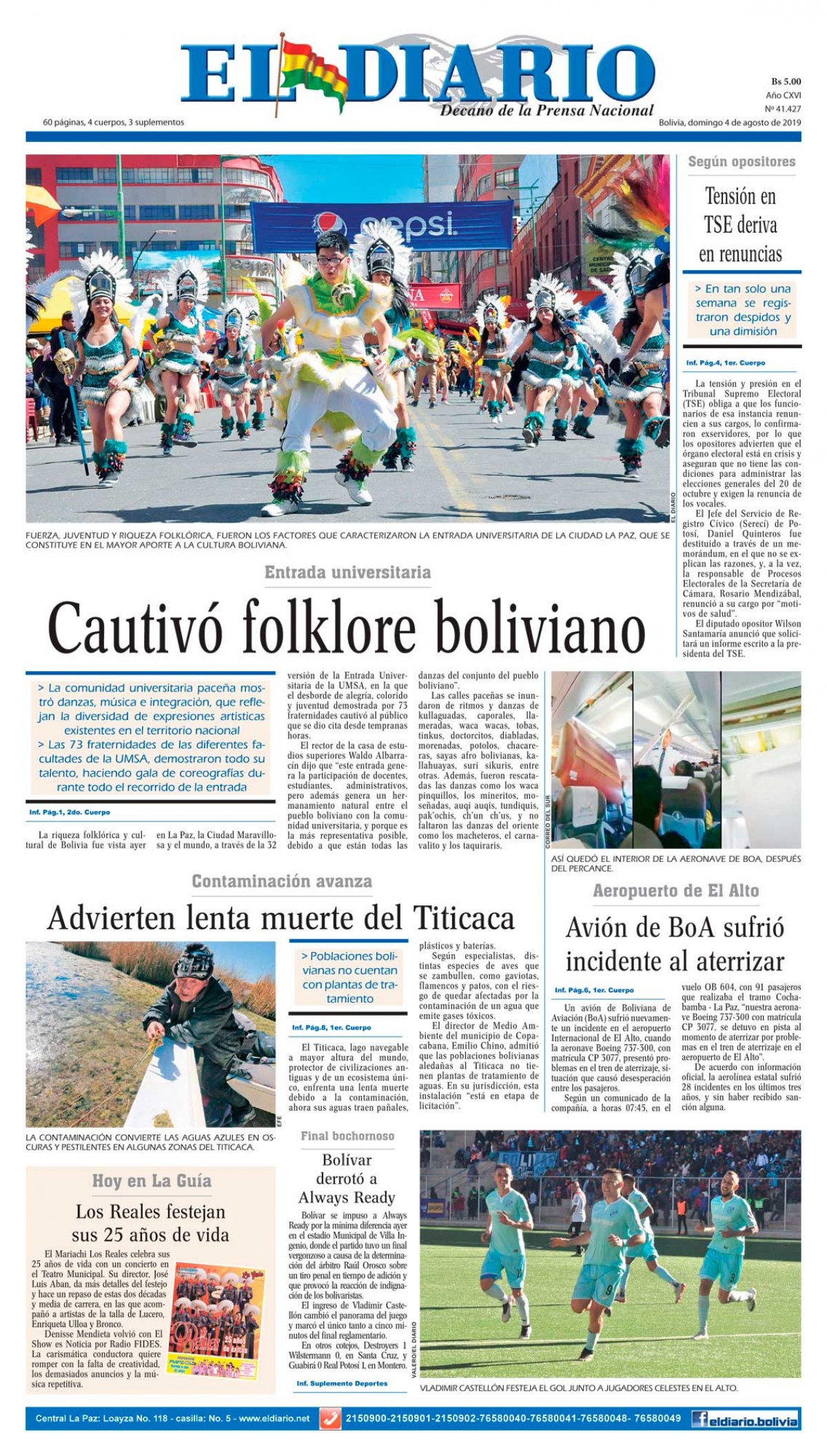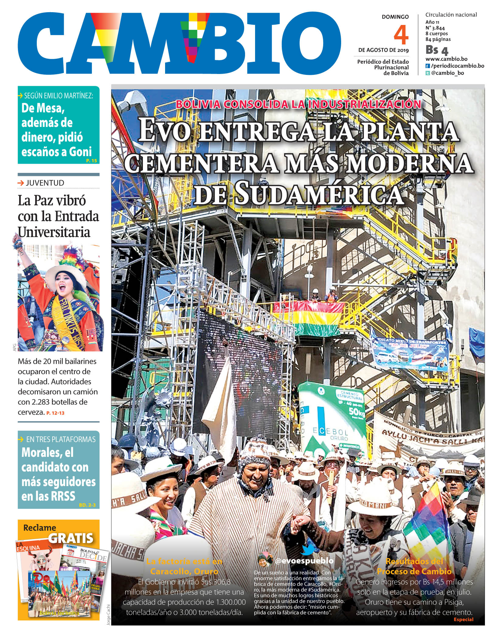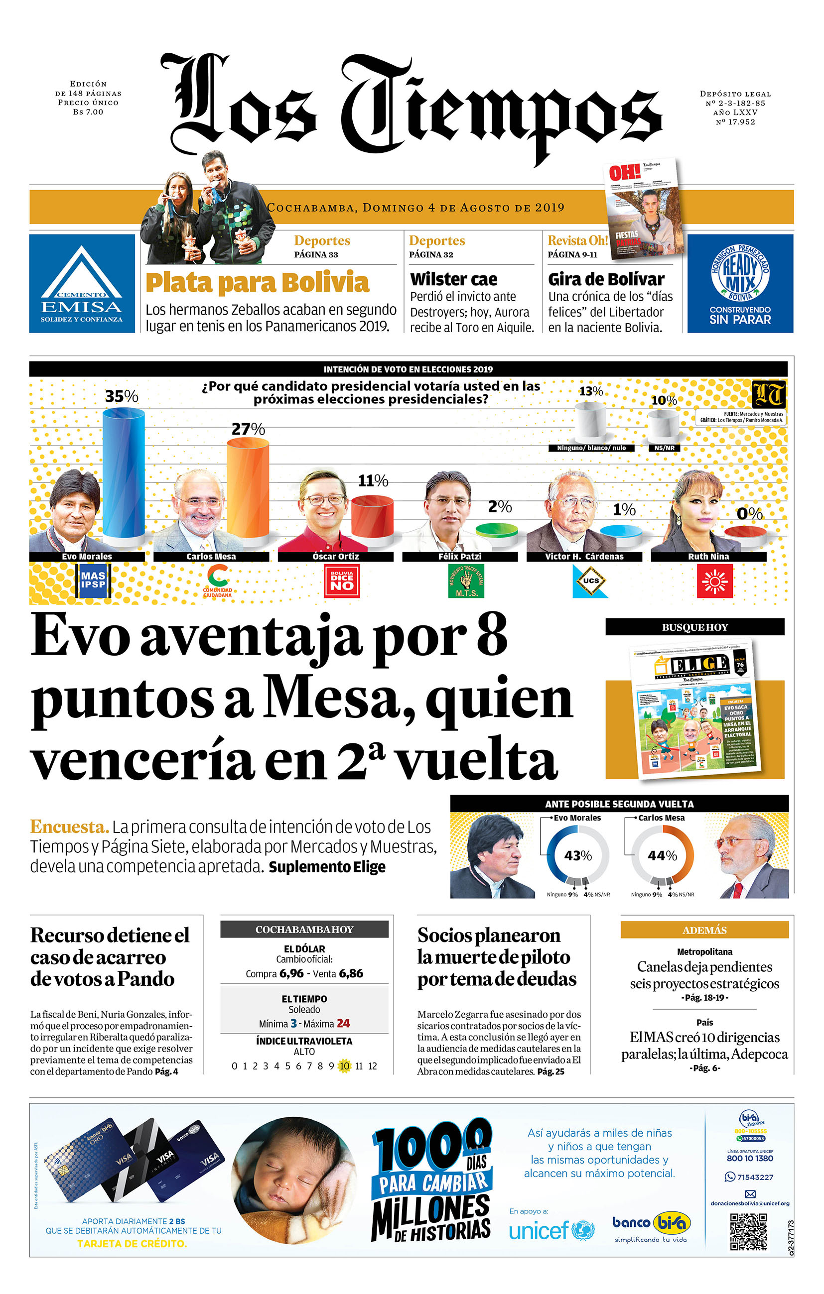 Portadas de periódicos de Bolivia del domingo 4 de agosto de 2019Categorías MonitoreoEtiquetas , Portadas de periódicos 04/08/2019 Los Tiempos – El Día – La Razón – Cambio – El Diario – Página Siete – Opinión