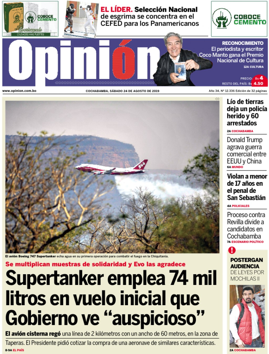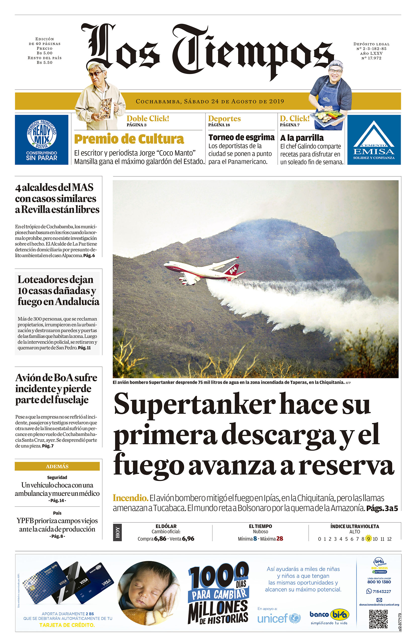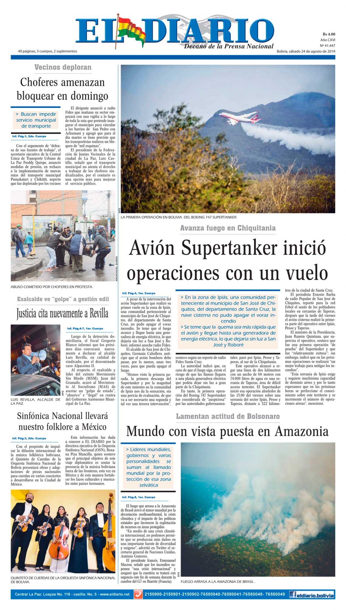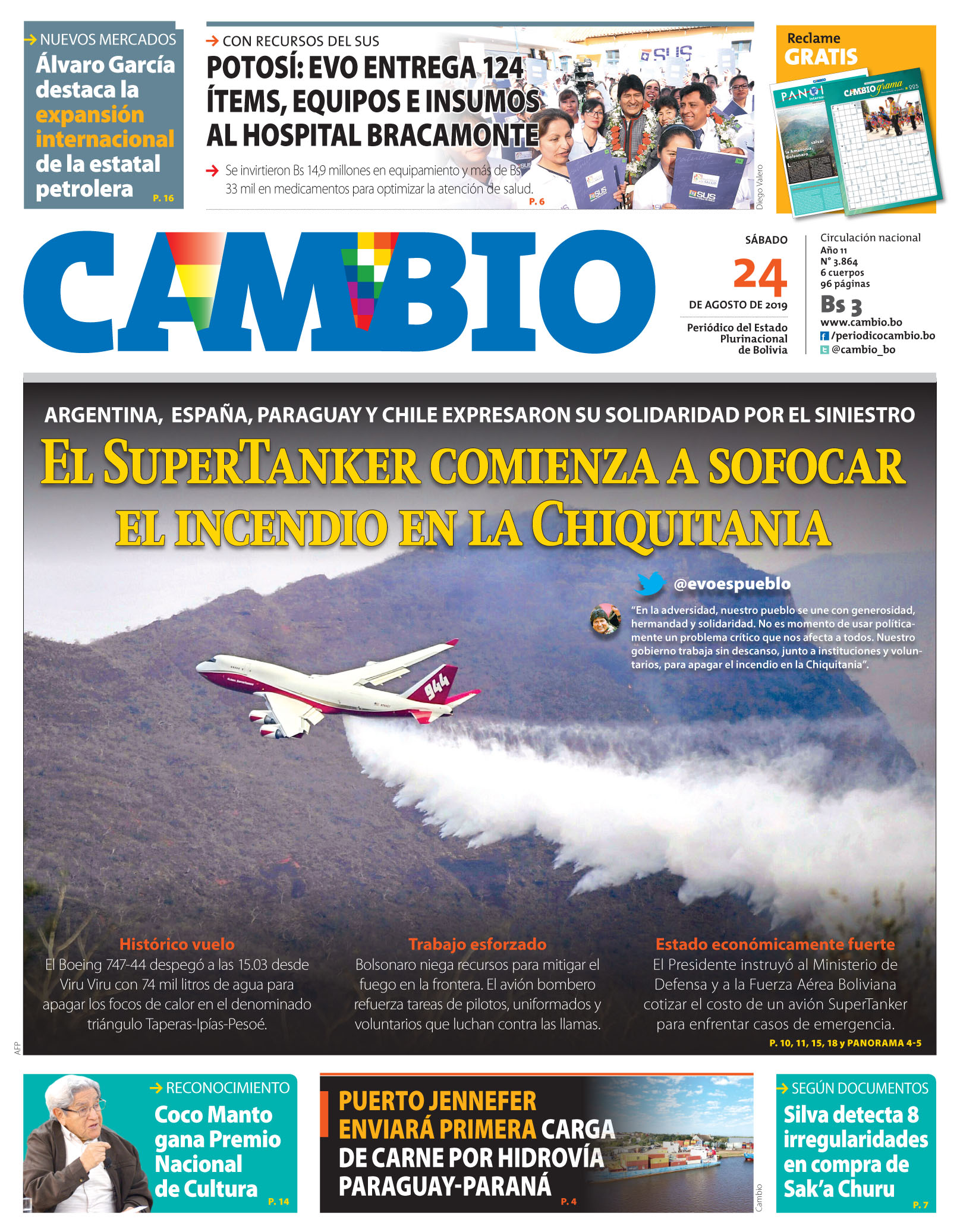 Portadas de periódicos de Bolivia del sábado 24 de agosto de 2019Categorías MonitoreoEtiquetas , Portadas de periódicos 24/08/2019 El Deber – Los Tiempos – El Día – La Razón – Cambio – El Diario – Página Siete – Opinión