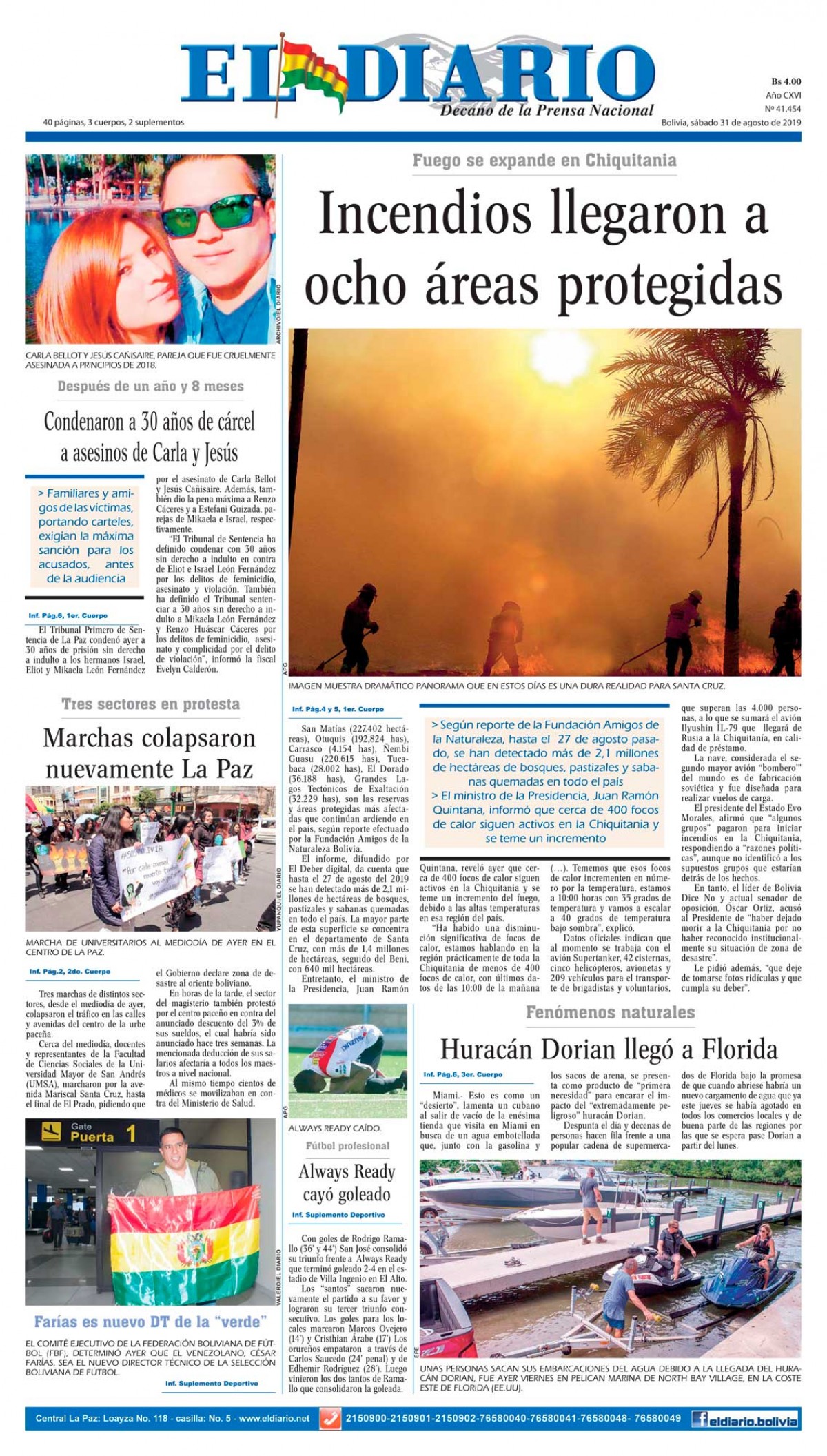 Portadas de periódicos de Bolivia del sábado 31 de agosto de 2019