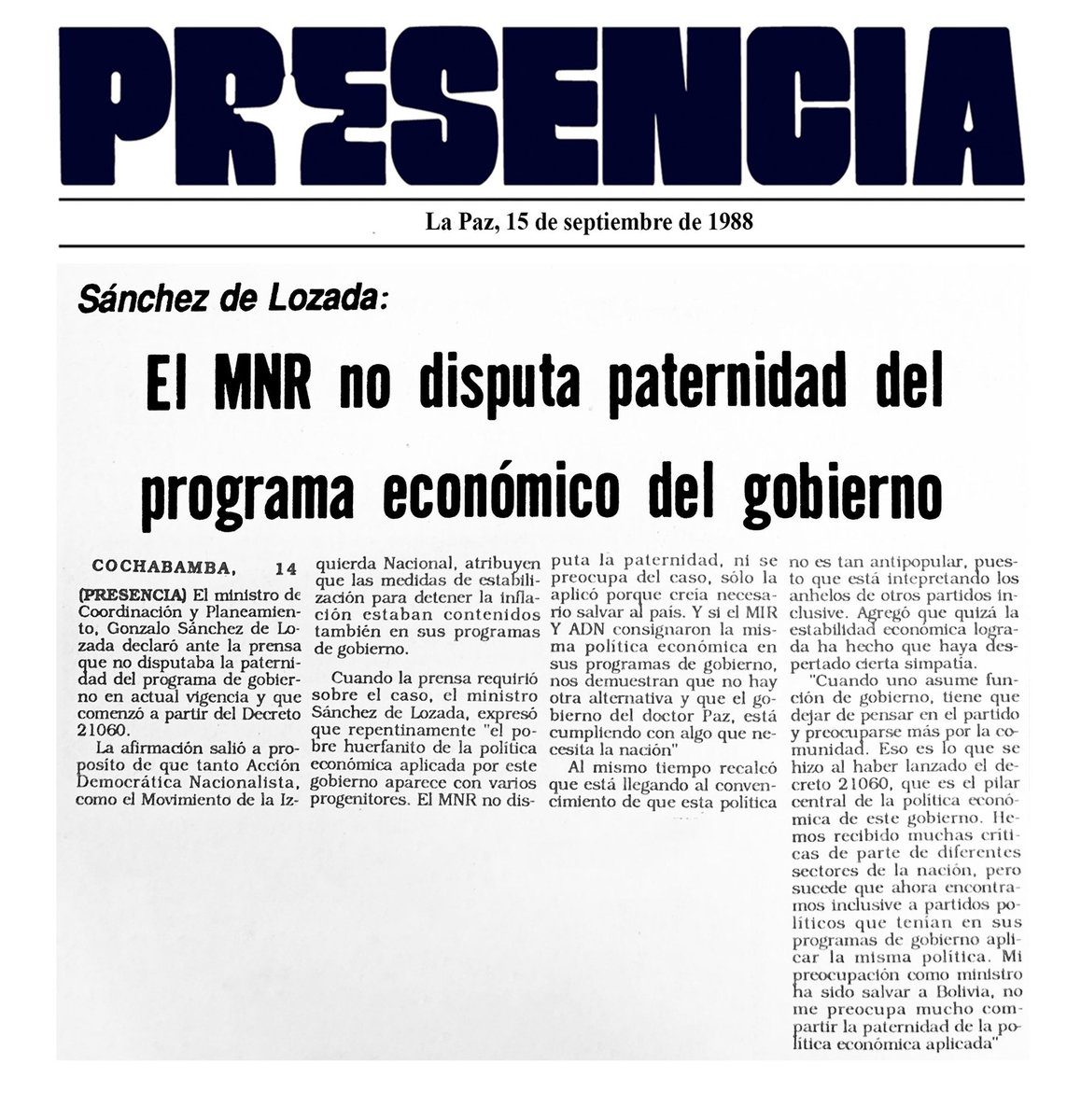 Como hoy, 1998, el entonces ministro de Planificación, Gonzalo Sánchez de Lozada, reafirmó la “paternidad” del MNR sobre el DS 21060 que impuso el modelo neoliberal de saqueo de nuestros RRNN y entreguismo de nuestra soberanía, junto al MIR y ADN. #Bolivia no volverá a ese pasado https://t.co/IHGrI5Va2E