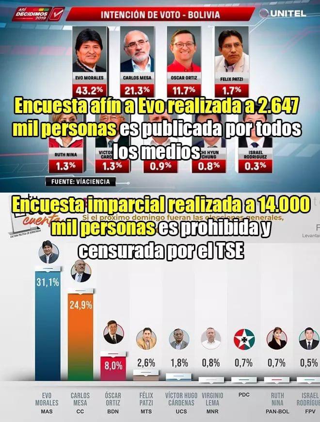 Dos serios problemas:1. El número de encuestados (2.647 o 14.000) no es criterio de validez.2. Una anota 22 pts de diferencia entre el 1ro y 2do; la otra, sólo 6.¿Tanta diferencia? ¡Las dos encuestas son sesgadas!@diarioeldeber@Diario_ElDia@pagina_siete@LosTiemposBol@ANF https://t.co/LgF3CtrloT