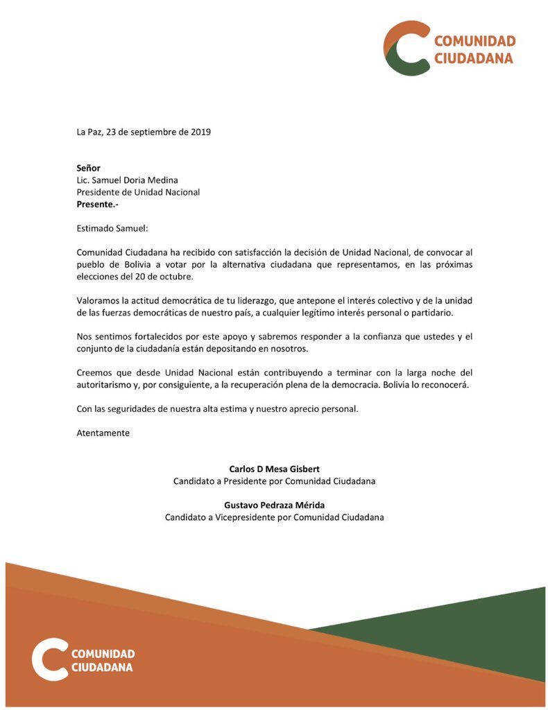 Estimado @SDoriaMedina:En @ComunidadCBo valoramos la actitud democrática de tu liderazgo, que antepone el interés colectivo al legítimo interés personal o partidario. #UnaBoliviaMejor https://t.co/OTtgRbefqq
