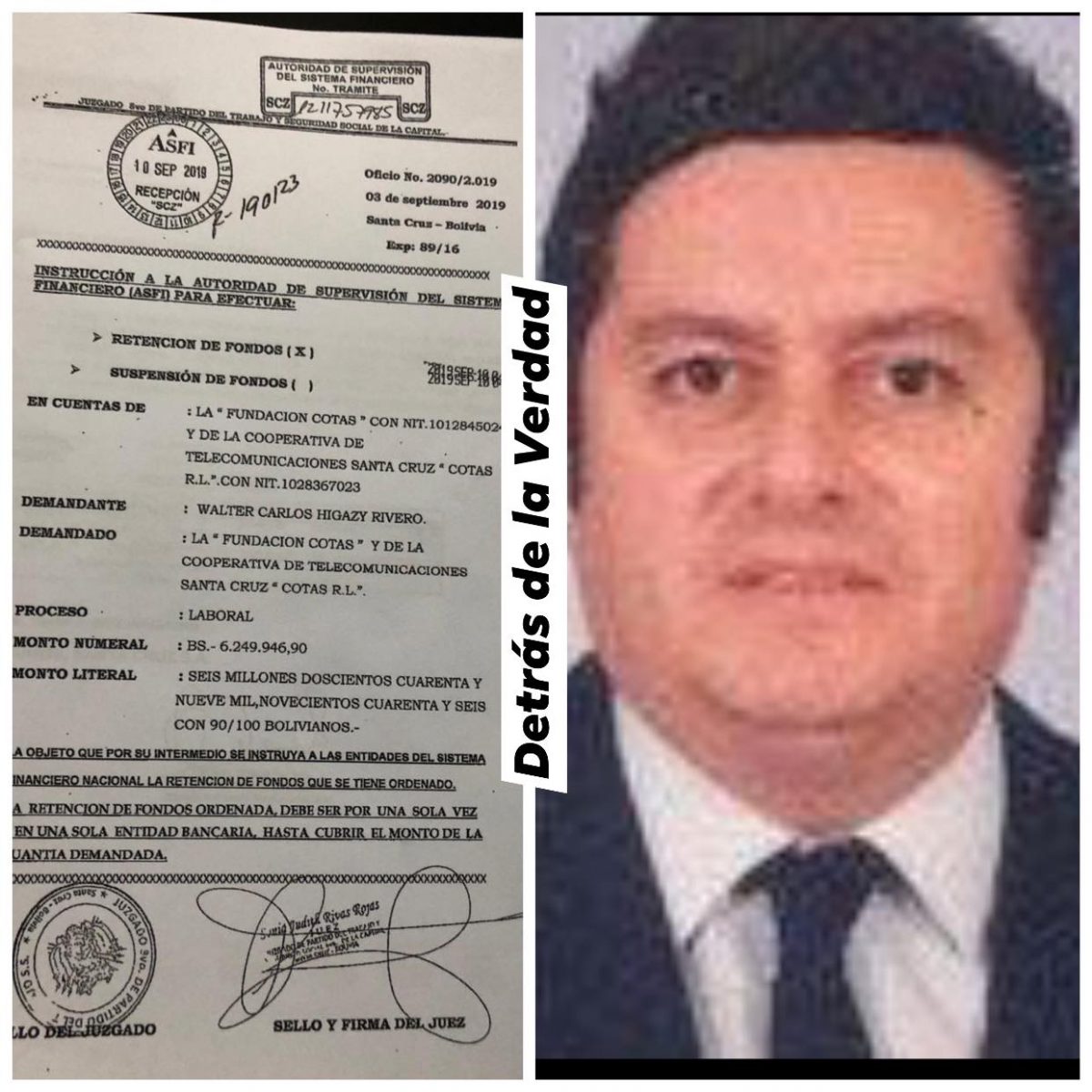 Ex director de Cotas busca pago de beneficios sociales por Bs. 6.249.946,90, a pesar que no percibía sueldoLa juez en materia laboral, Sonia Judith Rivas Rojas, ordenó la anotación de Bs. 6.249.946,90 de las cuentas de Cotas en el sistema financiero a raíz de una denuncia presentada por Walter Carlos Higazy Rivero quien ejerció el cargo de Director de la Fundación Cotas.Cotas en su defensa ante la juez laboral establece que Walter Higazi Rivero no percibía sueldo, si no una dieta como miembro del directorio de la Fundación Cotas por lo que no corresponde que la juez disponga pago y menos aún la retención de casi $us. 1.000.000 para el pago de beneficios sociales del demandante.