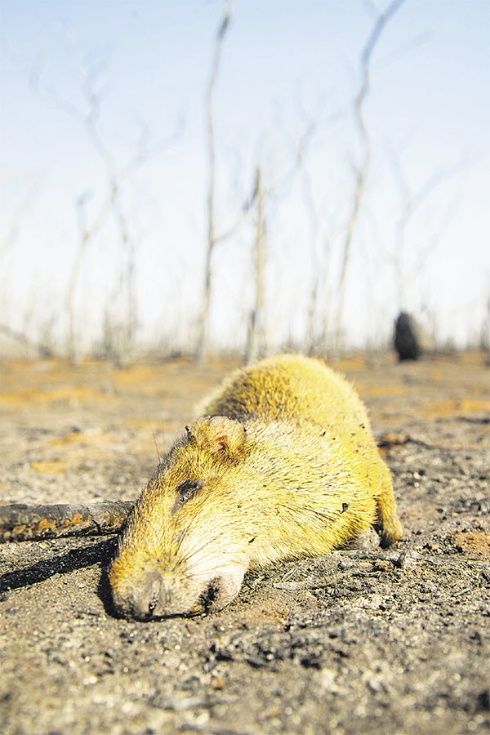 No es muy común que llueva en Ñembiguasu. Tiene un clima xérico y la lluvia se concentra en tres meses del año. Tras el fuego, la sequía continúa la matanza. A unos cien metros de las osamentas tres cerditos troperos, un jochi calucha se rindió. No estaba quemado. Tenía las patas el pelo tiznados por el camino recorrido en su búsqueda inútil de nuevos brotes y de agua. Quedó tendido en el arenal con un gesto que combinaba alivio y resignación.