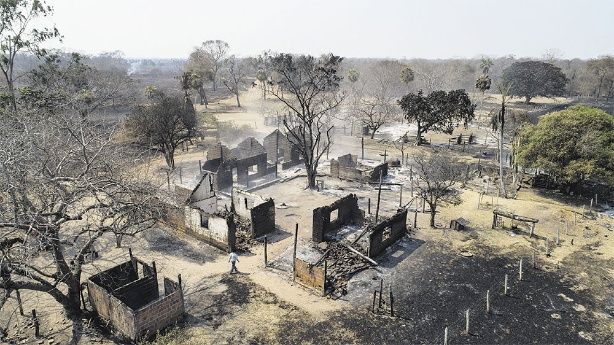 Esto es Turubai, una estancia en medio de San Matías, pero el hombre zarco, de unos 50 años, acaba de decir que esto se llama El Porvenir. Está sentado debajo de un jorori monumental que aleja los 40 grados del suelo. A su alrededor, el beso del fuego sobre el pasto es evidente: el suelo tiene un color negro gomoso, como un desastre petrolero.