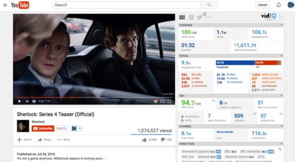 Ya hemos grabado el audio, hemos editado el vídeo y subido a la plataforma, llega el momento de analizar resultados.Aunque el propio Youtube cuenta con un sistema completo de estadísticas, hay muchas cosas que podrían incluirse en él, y para ello existen extensiones de Chrome que aumentan la información disponible.Uno de los más famosos es VidIQ, plugin instalado más de 900.000 veces y capaz de ofrecer información que no se encuentra en ningún otro lugar.