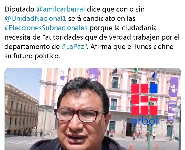 Mientras se comenta con insistencia sobre un acuerdo que sería firmado a comienzos de la semana entre Samuel Doria Medina y Carlos Mesa, para darle a CC un “aliado suplente” que sustituya en algo a la pérdida estratégica de la alcaldía paceña (ante el imaginario, ya que no en la realidad), la movida estaría provocando nuevos cismas en UN.El próximo en buscar su propio camino sería el diputado Amílcar Barral, quien acaba de tuitear que “con o sin Unidad Nacional seré candidato en las Elecciones Subnacionales, porque la ciudadanía necesita autoridades que de verdad trabajen por el departamento de La Paz”.La disidencia de Barral estaría relacionada con los pactos establecidos entre Doria Medina y Mesa, priorizados en el cuoteo por el primero ante la creciente desconfianza en una victoria de CC en los comicios de octubre. Ver declaraciones de Barral.