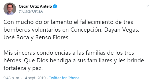 #P7InformaEl candidato por Bolivia Dice No, @OscarOrtizA expresó que «con mucho dolor» lamenta el fallecimiento de los tres bomberos voluntarios que fallecieron en Concepción y los calificó de «héroes». https://t.co/AJaWXoNyKS