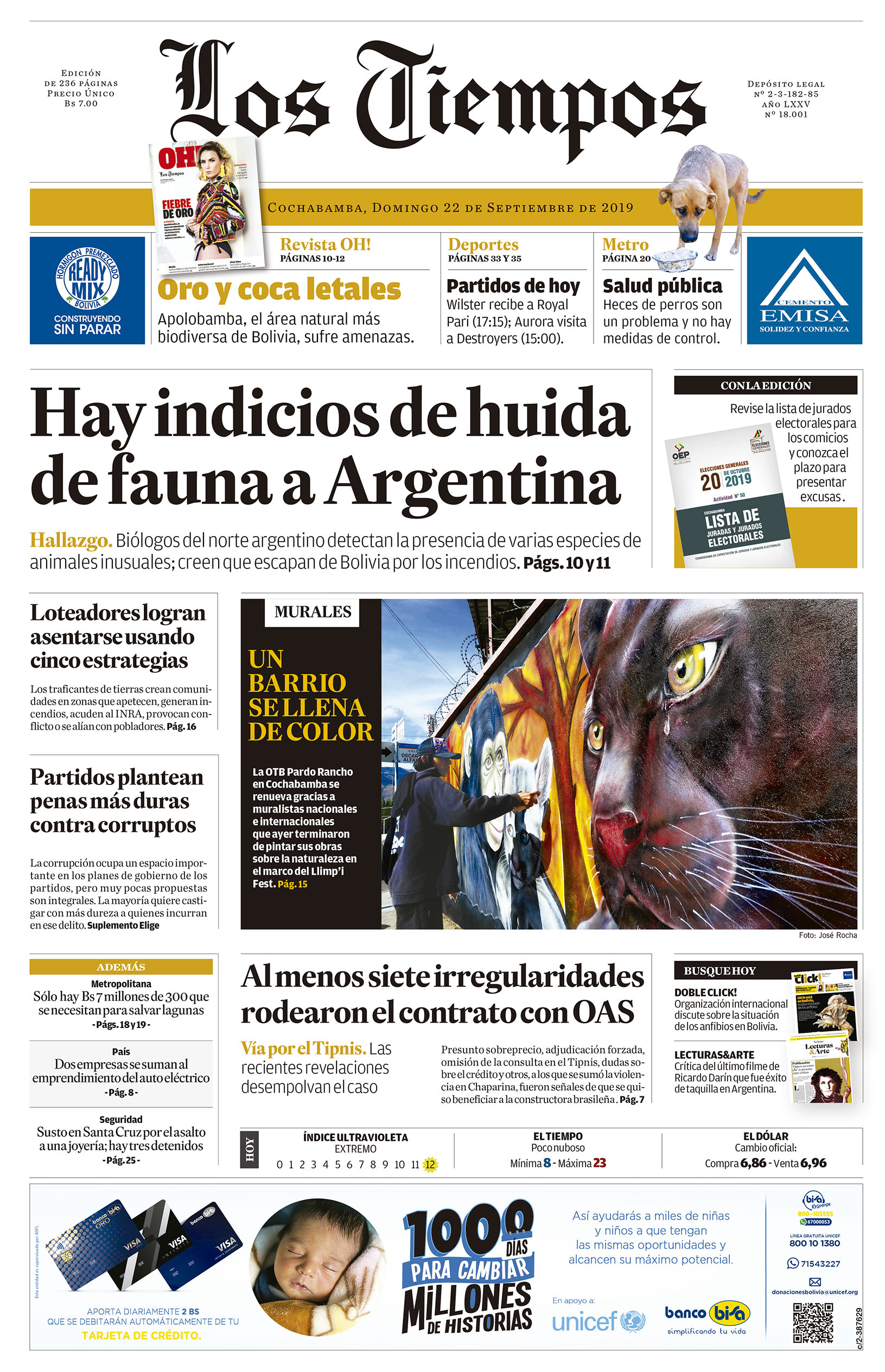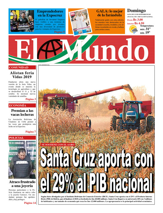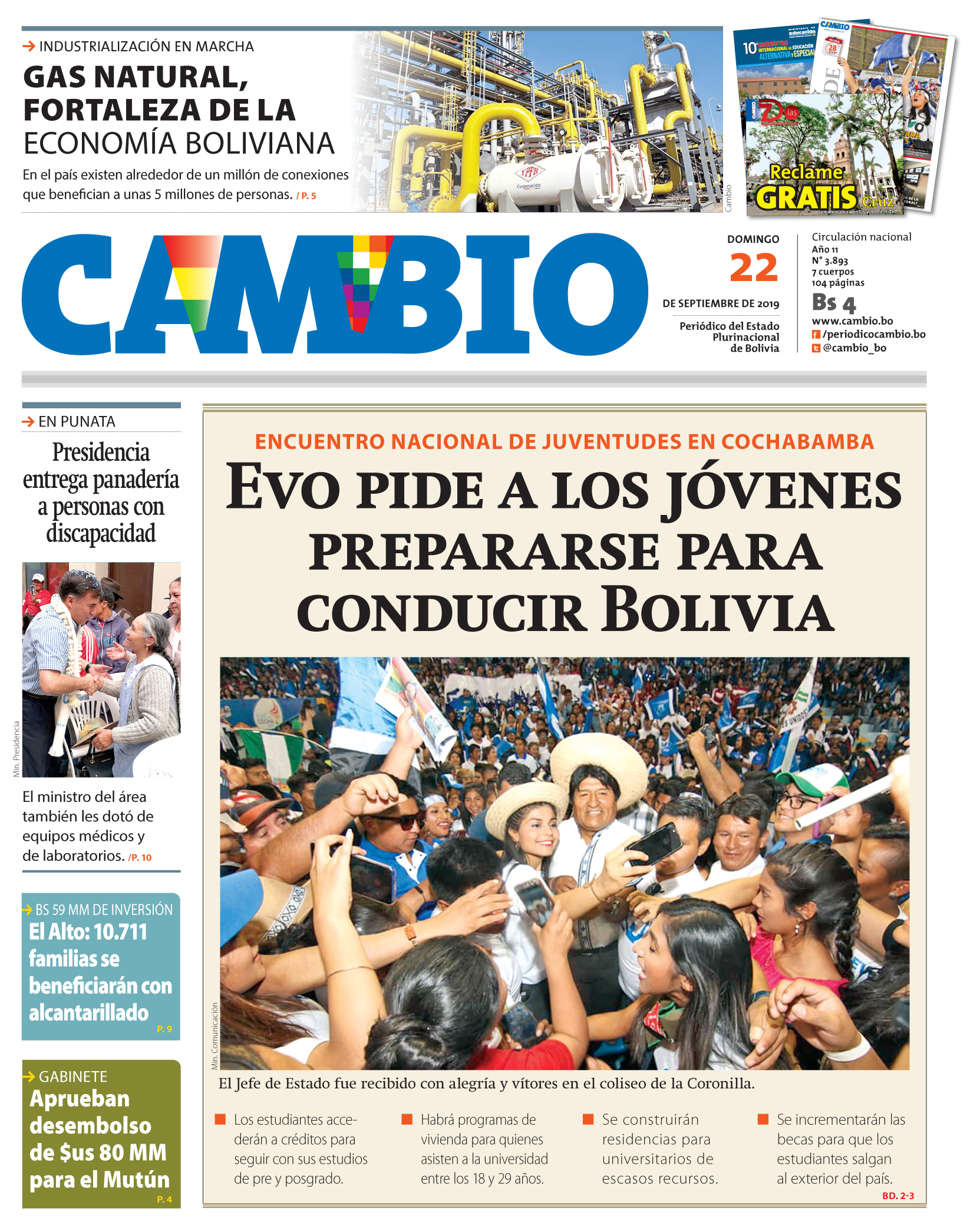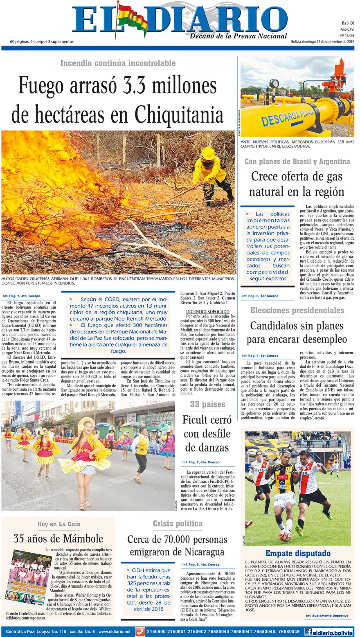 Portadas de periódicos de Bolivia del domingo 22 de septiembre de 2019Categorías MonitoreoEtiquetas , Portadas de periódicos 22/09/2019 El Deber – Los Tiempos – El Día – La Razón – Cambio – El Diario – Página Siete – Opinión