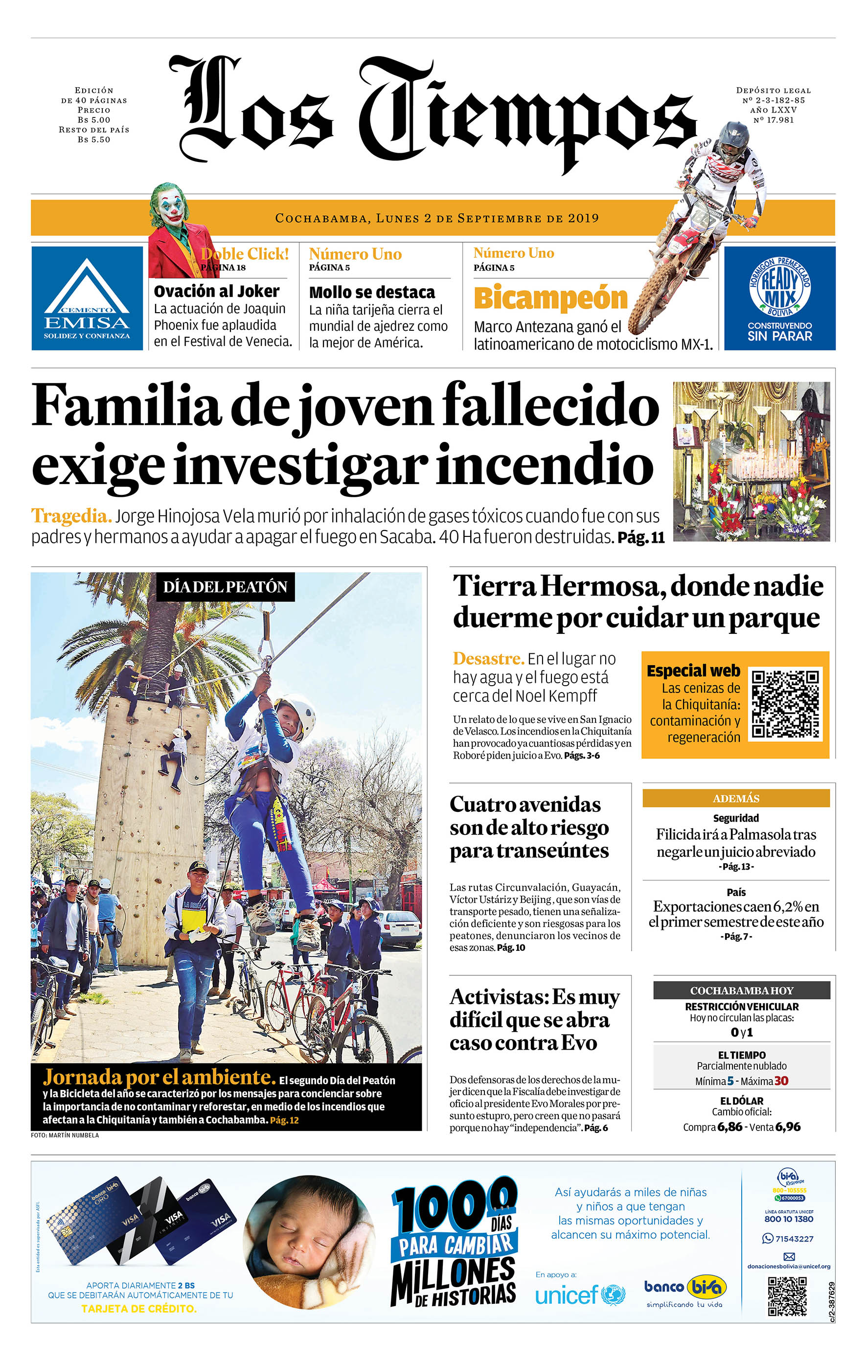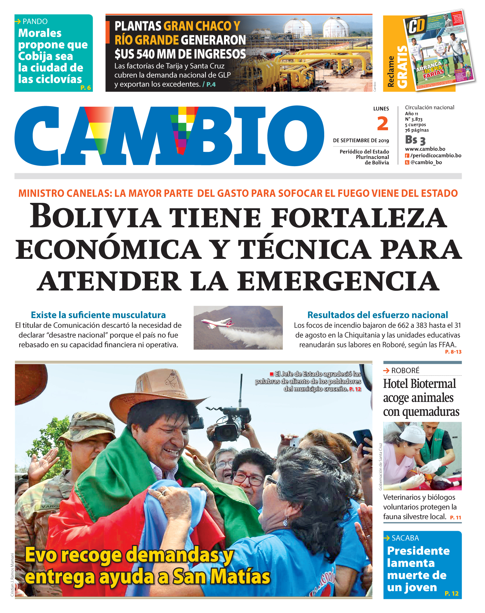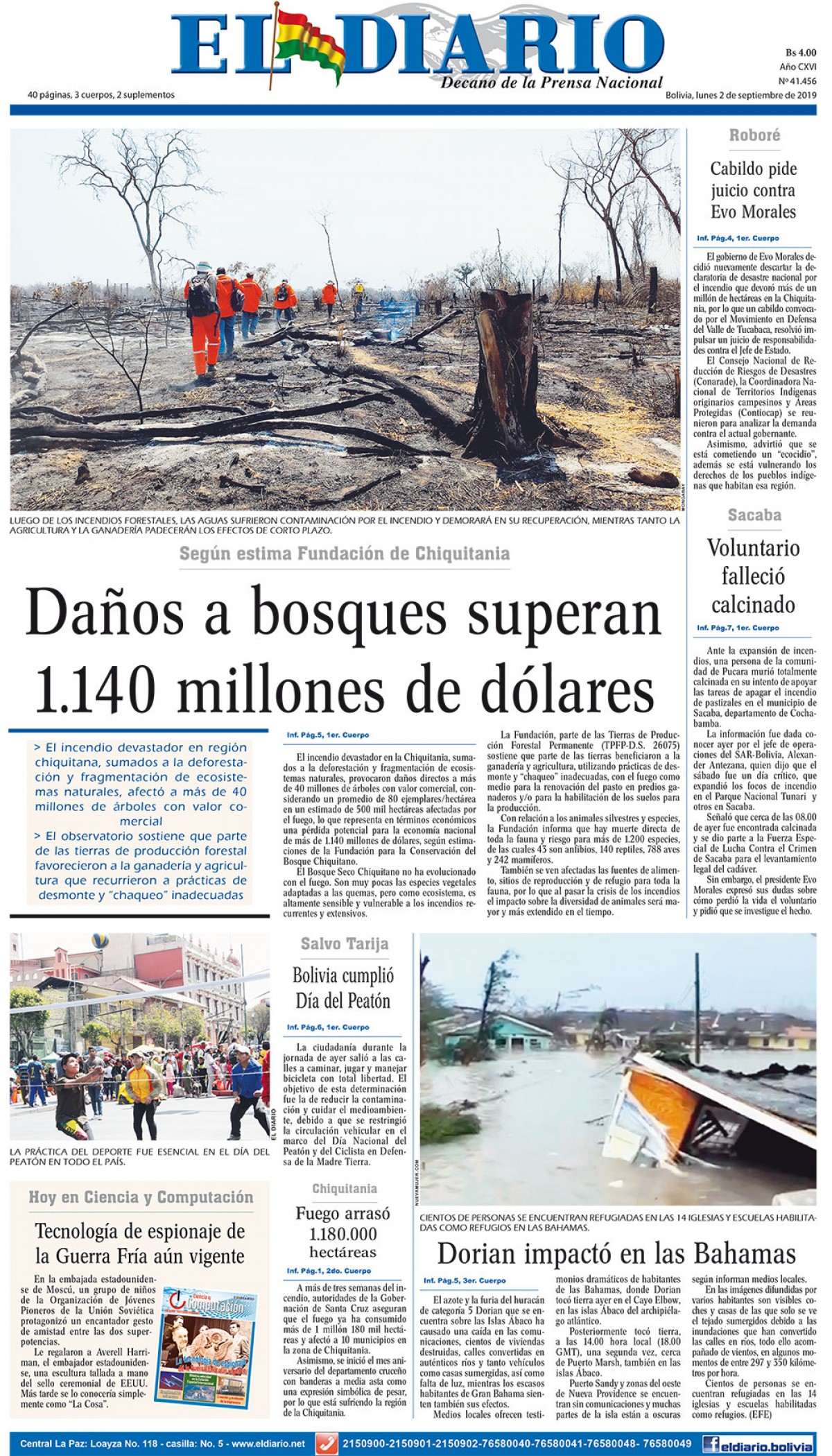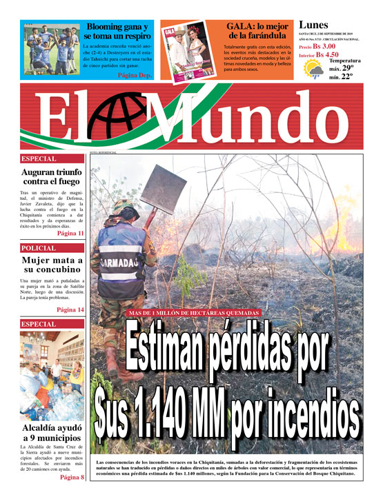 Portadas de periódicos de Bolivia del lunes 2 de septiembre de 2019Categorías MonitoreoEtiquetas , Portadas de periódicos 02/09/2019 El Deber – Los Tiempos – El Día – La Razón – Cambio – El Diario – Página Siete – Opinión – El Mundo – La Estrella del Oriente