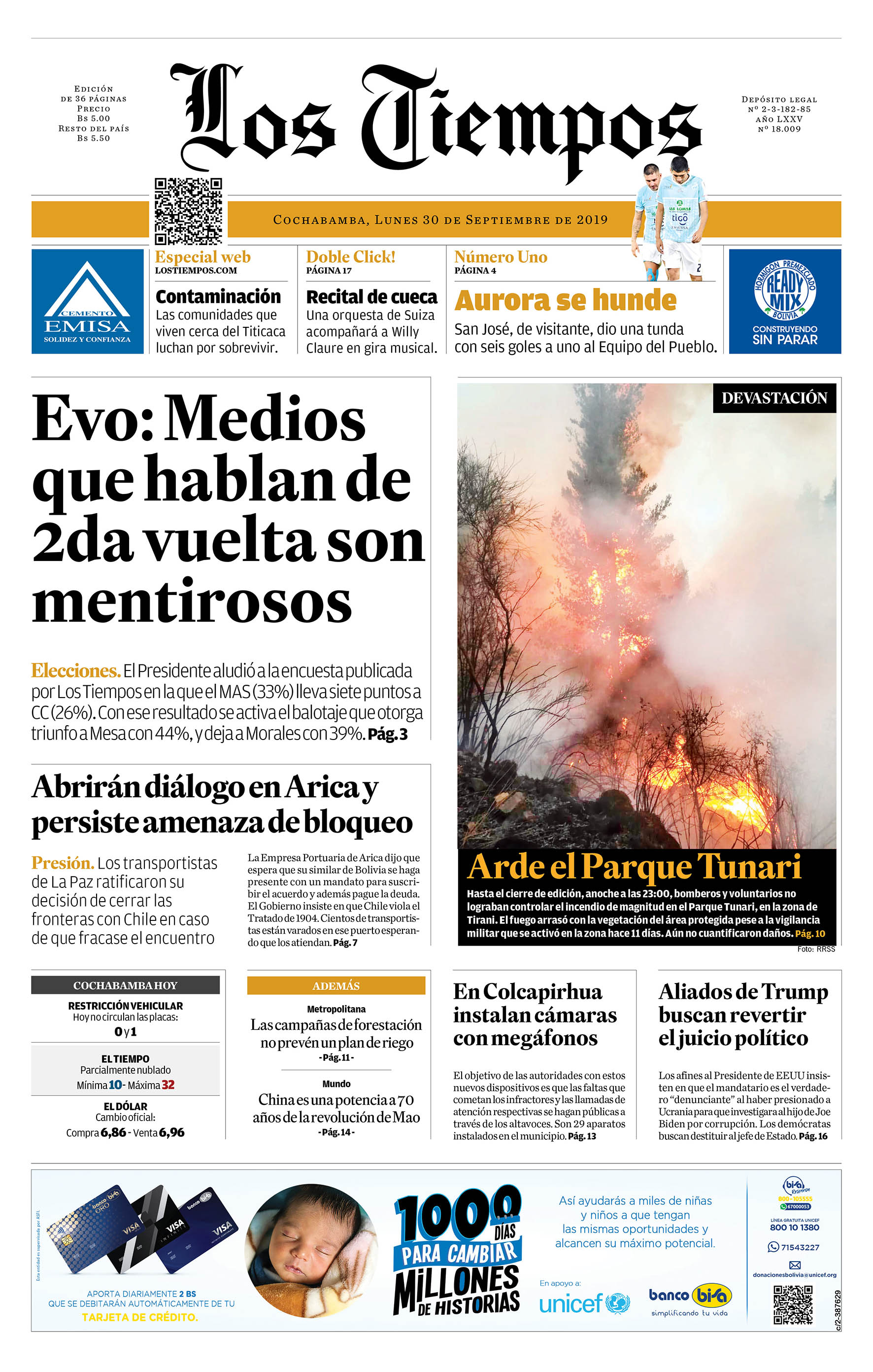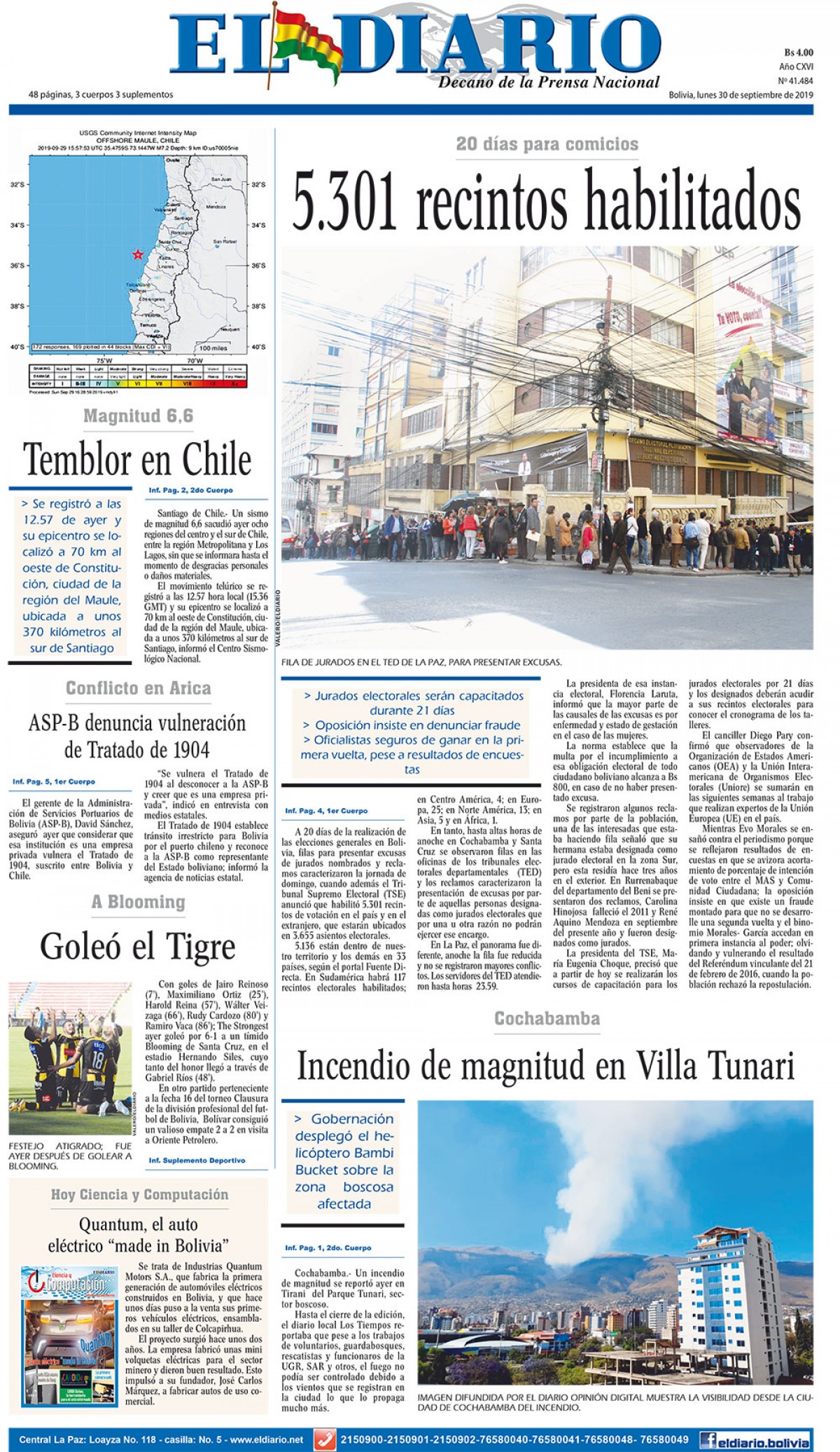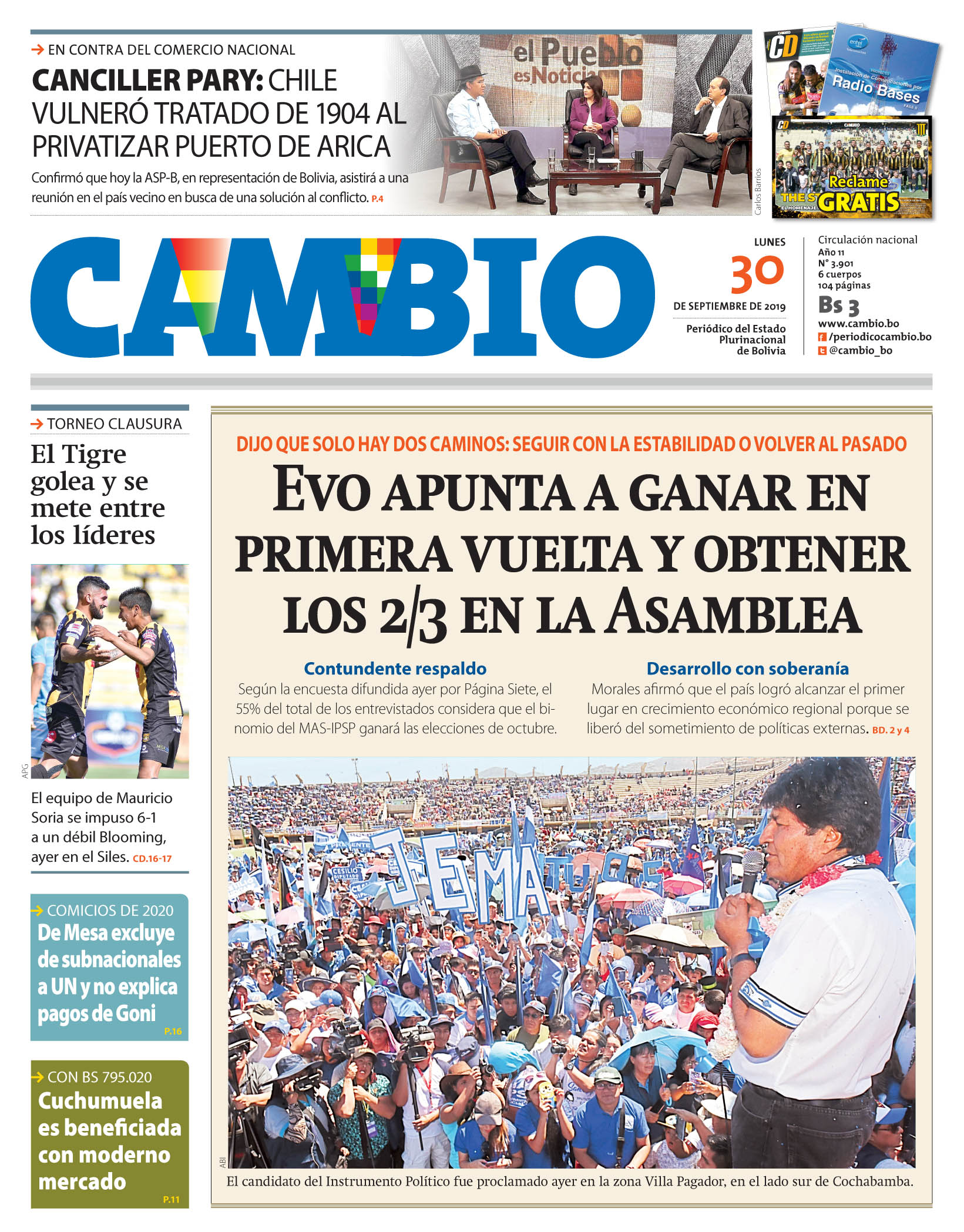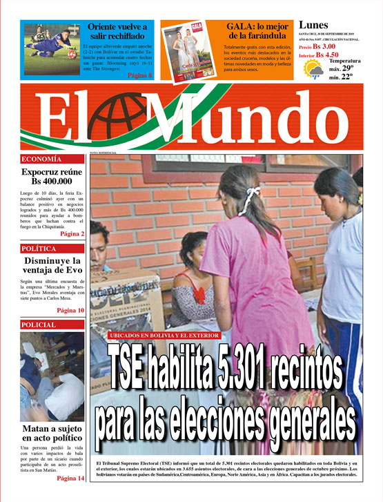 Portadas de periódicos de Bolivia del lunes 30 de septiembre de 2019