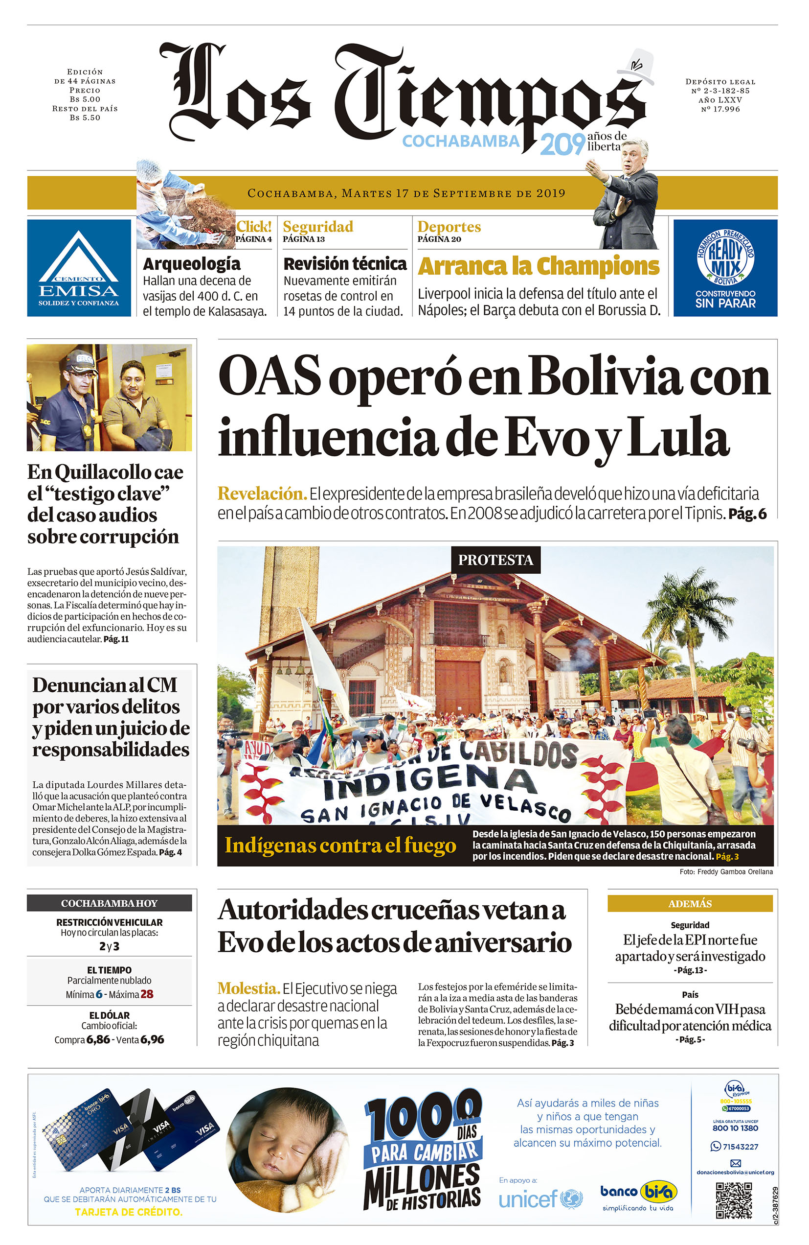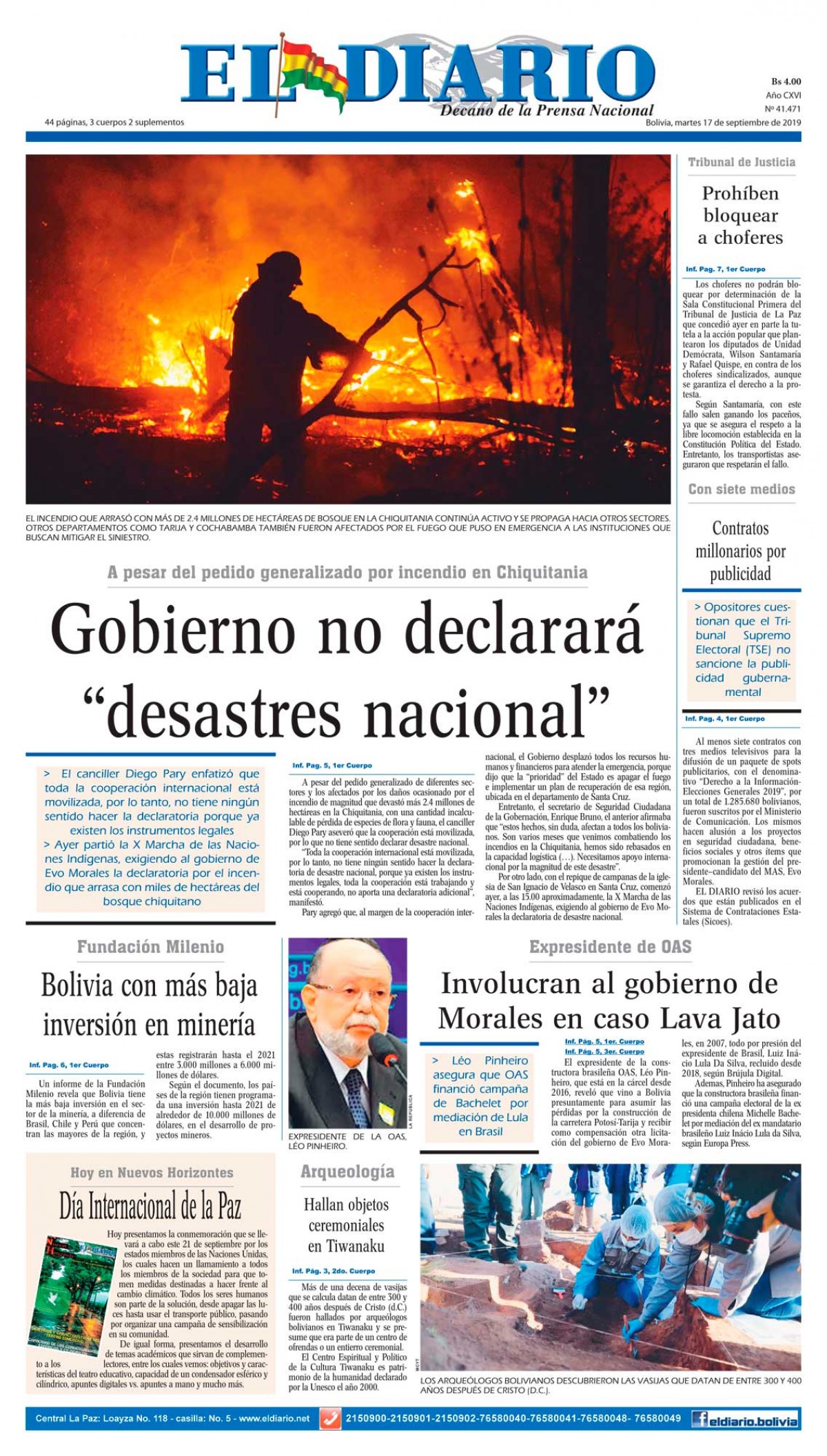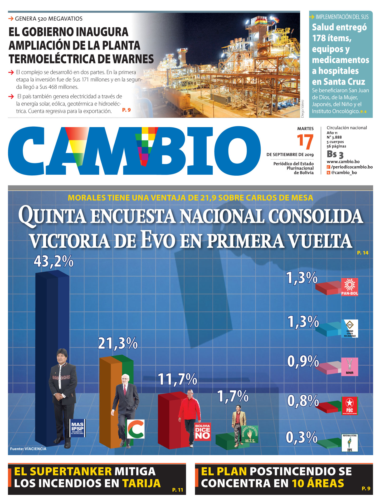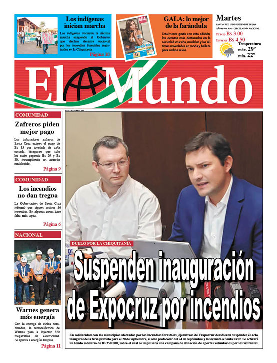 Portadas de periódicos de Bolivia del martes 17 de septiembre de 2019Categorías MonitoreoEtiquetas , Portadas de periódicos 17/09/2019 El Deber – Los Tiempos – El Día – La Razón – Cambio – El Diario – Página Siete – Opinión – El Mundo – La Estrella del Oriente