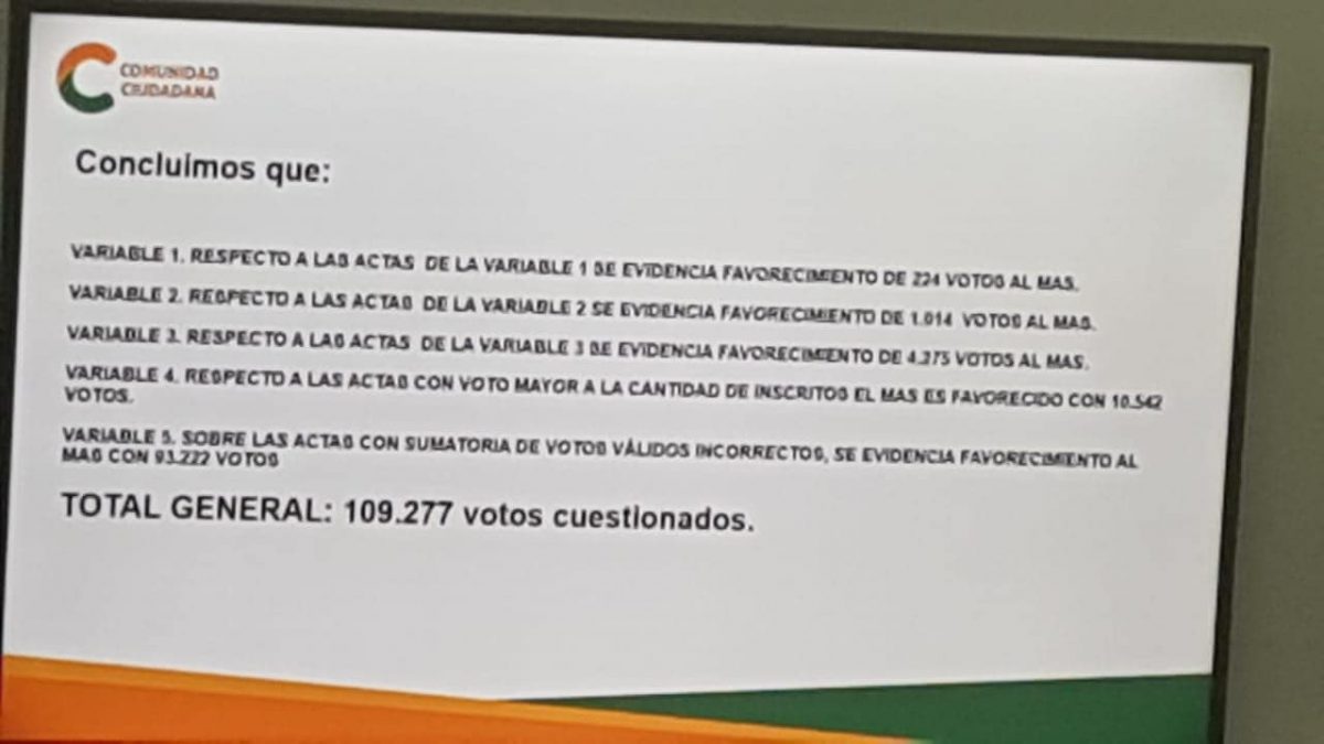 La Paz.- Carlos Alarcón, denunció que el TSE consolida el fraude porque se evidenció en una comparación de actas del TREP y del cómputo oficial que en algunos casos se resta votos a CC y se aumenta al MAS. En otros caso se mantiene votos de CC y se aumenta al MAS en total se denuncia que son 109. 227 votos los cuestionados.