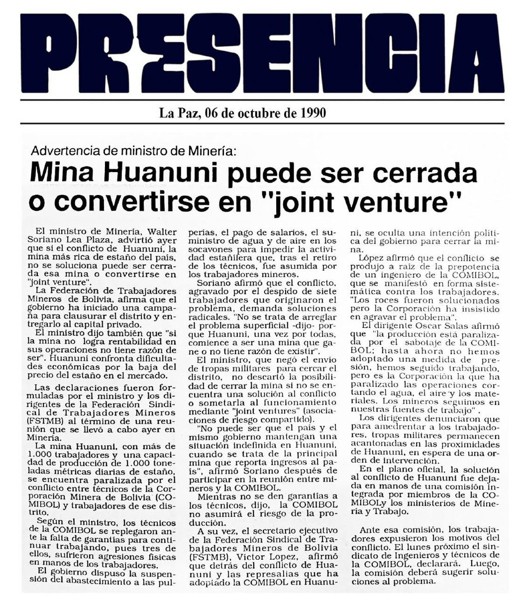 Como hoy, 1990, el gobierno de Jaime Paz advirtió con cerrar la mina Huanuni debido a que “no lograba rentabilidad”, pero los trabajadores denunciaron que era un pretexto para privatizarla. Así fue como los neoliberales empezaron el saqueo y la entrega de nuestro patrimonio. https://t.co/lqvs7psfne