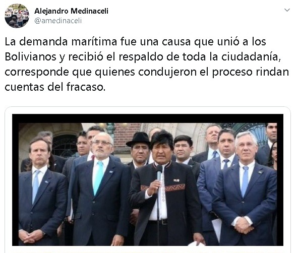 Desde su cuenta en Twitter, el jefe departamental de UN en La Paz, Alejandro Medinaceli, pidió que “quienes condujeron el proceso (de la demanda marítima) rindan cuentas del fracaso”, adjuntando una imagen donde se ve al presidente Evo Morales y al vocero Carlos Mesa.En días pasados, fracasó el intento de alianza entre UN y CC para las elecciones subnacionales. El jefe del primer partido, Samuel Doria Medina, había señalado que esperaba una “reciprocidad” de CC por su apoyo para las elecciones del 20 de octubre, pero el domingo Carlos Mesa informó que concurriría a los comicios subnacionales del próximo año sin UN.