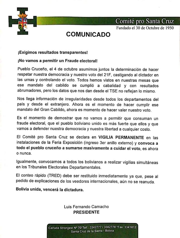 COMUNICADO¡Exigimos resultados transparentes, ¡No vamos a permitir un Fraude electoral!Pueblo Cruceño, el 4 de octubre asumimos juntos la determinación de hacer respetar nuestra democracia y nuestro voto del 21F, castigando al dictador en las urnas y controlando el voto. Todos hemos visto en nuestras mesas que ese mandato del cabildo se cumplió a cabalidad y con resultados abrumadores, pero los datos que nos dan desde el TSE no reflejan lo mismo.Nos llega información de irregularidades desde todos los departamentos del país y desde el extranjero. Ahora es el momento de hacer cumplir ese mandato del Gran Cabildo, ahora es momento de hacer valer nuestro voto.Es el momento de demostrar que no vamos a permitir que consuman un fraude electoral, que el pueblo boliviano unido es más fuerte que ellos y que vamos a defender nuestra democracia y nuestra libertad a cualquier costo.El Comité pro Santa Cruz se declara en VIGILIA PERMANENTE en las instalaciones de la Feria Exposición (ingreso 3er anillo externo) y convoca a todo el pueblo cruceño a sumarse masivamente a cuidar el voto, es ahora o nunca.Igualmente, convocarnos a todos los bolivianos a realizar vigilias simultáneas en los Tribunales Electorales Departamentales.El conteo rápido (TRED) debe ser restituido inmediatamente ya que, pese al pedido de explicaciones de los veedores internacionales, aún no se reanuda.Bolivia unida, vencerá la dictadura.