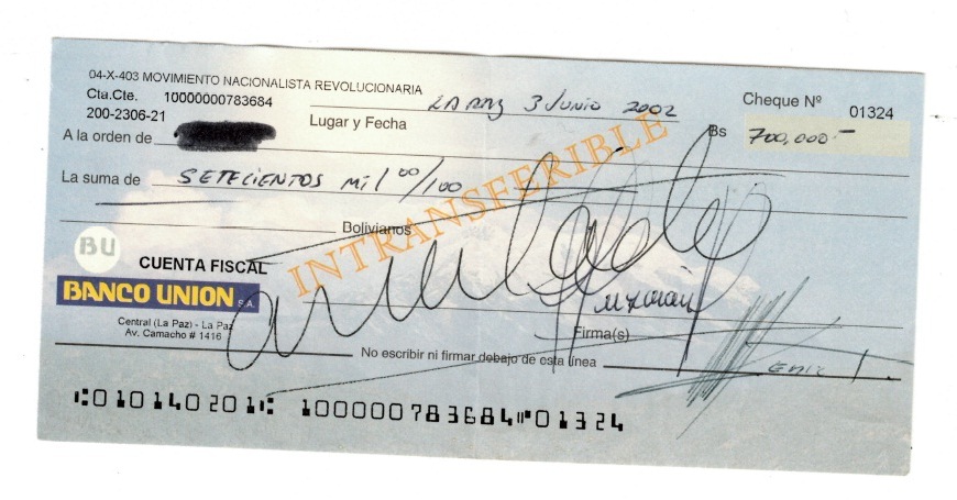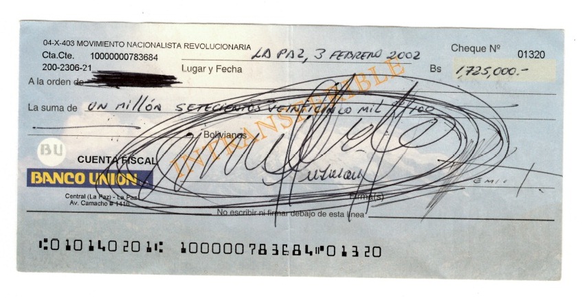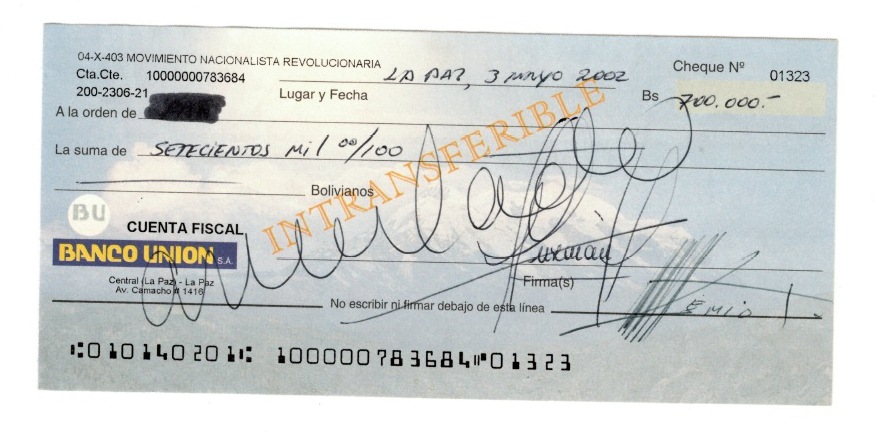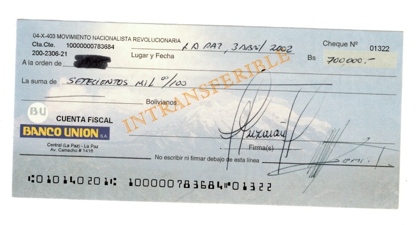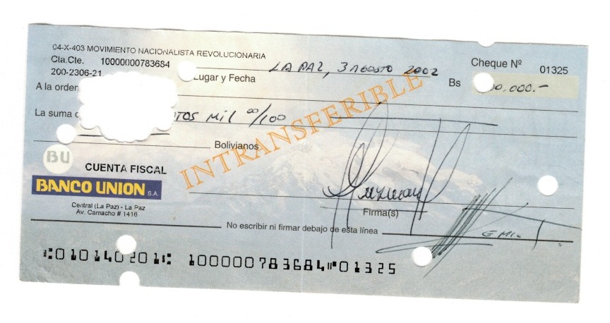 Emilio Martínez Cardona“El Mecanismo” para que Carlos Mesa cobrara el monto millonario con el que condicionó su candidatura a la vicepresidencia en el 2002 se habría basado en 6 cheques post-datados, entregados al momento del acuerdo económico. Estos cheques funcionaban como garantía de los pagos posteriores en efectivo que se harían en los meses siguientes.Como se recordará por anteriores entregas de nuestra investigación, el 3 de febrero del 2002 la Convención Nacional del MNR eligió a Carlos Mesa como candidato a la vicepresidencia. Cinco días antes, según testimonio de Mauricio Balcázar recogido en el libro “El Caudillo Ilustrado”, Mesa había renunciado a esa postulación y tres días antes exigió “extorsivamente” (de acuerdo a la expresión del ex ministro) el pago de 1 millón 200.000 dólares para acceder a la proclamación. En documentación que hicimos pública dos meses atrás, consta que la cuenta del canal PAT, del cual Mesa era por entonces principal propietario, recibió depósitos por la suma de 831.454,61 dólares, desde mediados del 2002 hasta poco antes de la crisis de octubre de 2003. Complementando esto, publicamos ahora la lista de 6 cheques pos-datados, que habrían sido entregados al momento del acuerdo. La información de fuente reservada con la que contamos indica que al llegar la fecha de cada cheque éstos iban siendo devueltos al equipo de campaña y anulados, contra el pago de la suma correspondiente a la persona que manejaba las finanzas del entonces postulante a la vicepresidencia.Evidentemente, tratándose de documentación con tachaduras (presumiblemente hechas en la anulación), la veracidad de la misma debería ser confirmada por un peritaje del IDIF.Los cheques del “Mecanismo” Fueron girados contra la cuenta fiscal del MNR No. 10000000783684 del Banco Unión:Cheque No. 1320, girado al 3 de febrero de 2002 por 1.725.000 Bs.Cheque No. 1321, girado al 3 de marzo de 2002 por 700.000 Bs.Cheque No. 1322, girado al 3 de abril de 2002 por 700.000 Bs.Cheque No. 1323, girado al 3 de mayo de 2002 por 700.000 Bs.Cheque No. 1324, girado al 3 de junio de 2002 por 700.000 Bs. Cheque No. 1325, girado al 3 de agosto de 2002 por 700.000 Bs.Total: 5.225.000 Bs. Como se ve, estos cheques (que suman cerca de 750.000 dólares) explicarían la mayor parte de los depósitos realizados a la cuenta de PAT.El cheque “firmado sobre el capó de un auto”Además, la cifra del primero, librado el día de la Convención Nacional del MNR, por el equivalente a 246.428 dólares, se acerca bastante a la cifra de 200.000 dólares mencionada por Balcázar que se habría entregado antes de la proclamación del binomio. Es el «cheque firmado sobre el capó de un auto” del que habla Carlos Valverde.La otra parte del “Mecanismo”: facturas por triplicado En una tesis presentada en la Universidad Católica Boliviana, la periodista Amalia Pando, ex socia de PAT, indica que un desfase en las cuentas del canal “fue cubierto por el MNR, que pagó una factura triplicada por los espacios que adquirió”.Bajo el NIT No. 1020401024, PAT facturó el 2002 más de 13 millones de Bs. De esa cifra, 3,1 millones de Bs. fueron facturados al MNR. Cuatro facturas representan el pago por triplicado: Factura No. 2125, del 21 de marzo de 2002, por 1.750.000 Bs.Factura No. 2126, del 25 de marzo de 2002, por 351.000 Bs. Factura No. 2127, del 25 de marzo de 2002, por 351.000 Bs. Factura No. 2164, también del 25 de marzo de 2002, por 352.000 Bs.Factura No. 2201, del 29 de abril de 2002, por 706.000 Bs. Total: 3.161.151 Bs. Al tipo de cambio de 7 Bs. por dólar que era el promedio del 2002, se tienen pagos por 451.593 dólares. Volviendo al millón 200.000 dólaresSumando los depósitos de PAT por 831.454,61 dólares recibidos por la vía Itaca, y los 451.593 dólares de las “facturas por triplicado”, llegamos a la cifra de 1.283.047,61 dólares, muy cercana al millón 200.000 dólares mencionada por Balcázar en sus entrevistas.Fuente: Esto También Sucede
