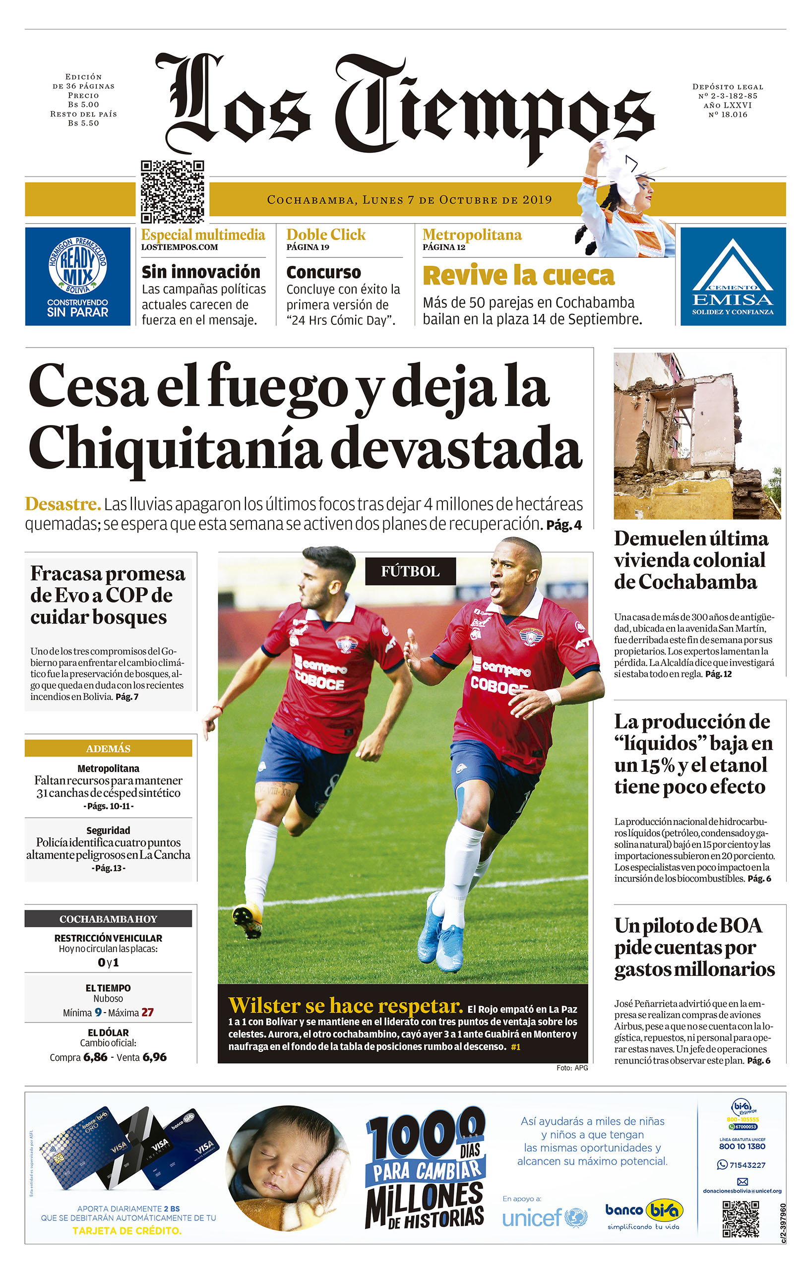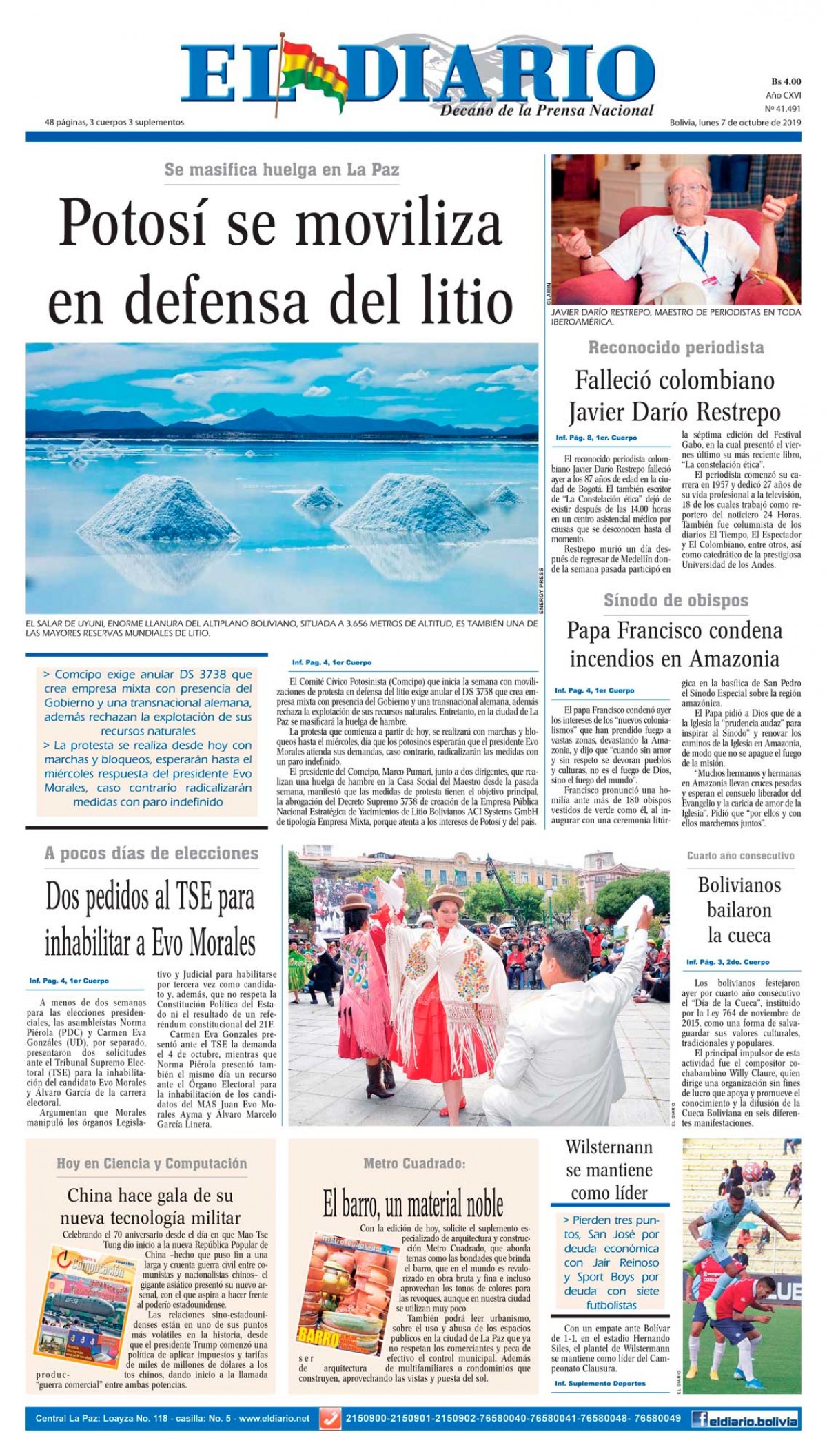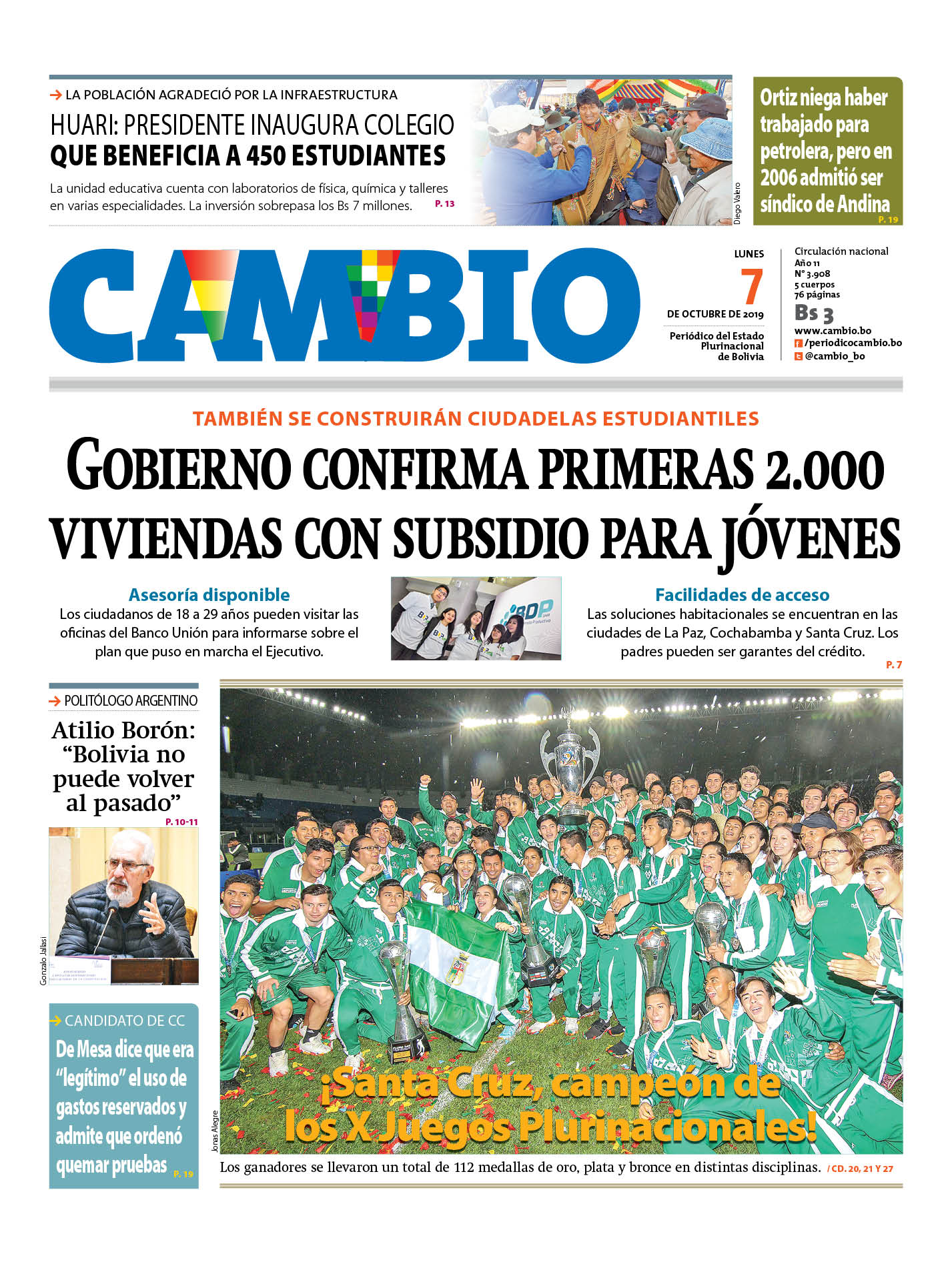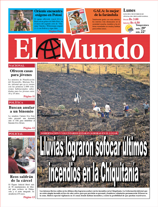 Portada de la edición impresa del lunes 7 de octubre de 2019Portada Edición ImpresaEdición 7-10-2019El Deber – Los Tiempos – El Día – La Razón – Cambio – El Diario – Página Siete – Opinión