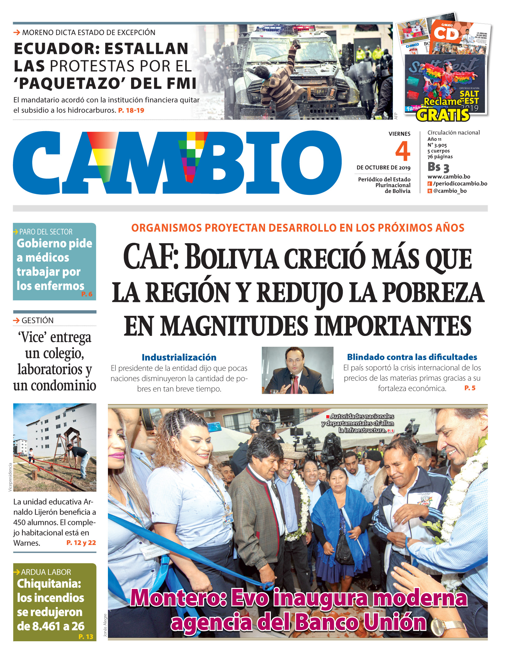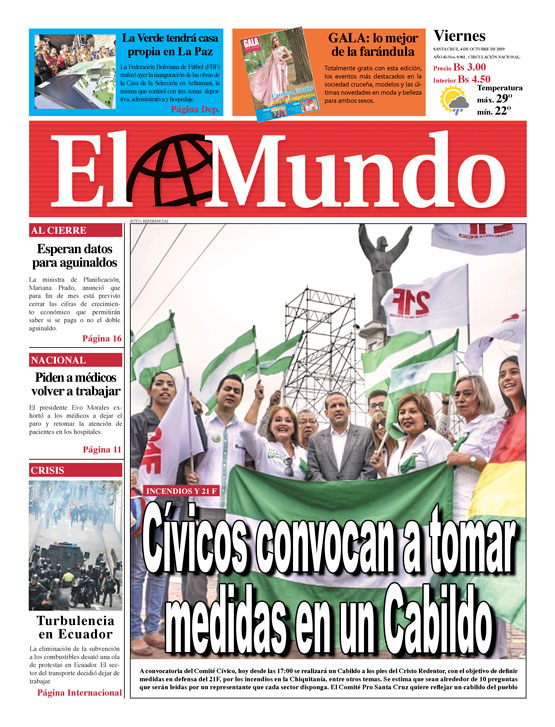 Portadas de periódicos de Bolivia del viernes 4 de octubre de 2019Categorías MonitoreoEtiquetas , Portadas de periódicos 04/10/2019 El Deber – Los Tiempos – El Día – La Razón – Cambio – El Diario – Página Siete – Opinión – La Estrella del Oriente – El Mundo