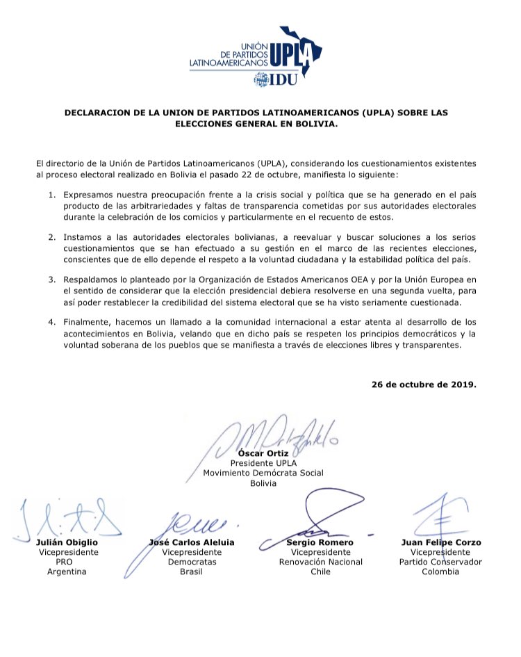 La Unión de Partidos Latinoamericanos (UPLA) emitió un comunicado respecto a las elecciones en Bolivia y a la necesidad de una segunda vuelta, para restaurar el orden democrático y la paz social en el país.