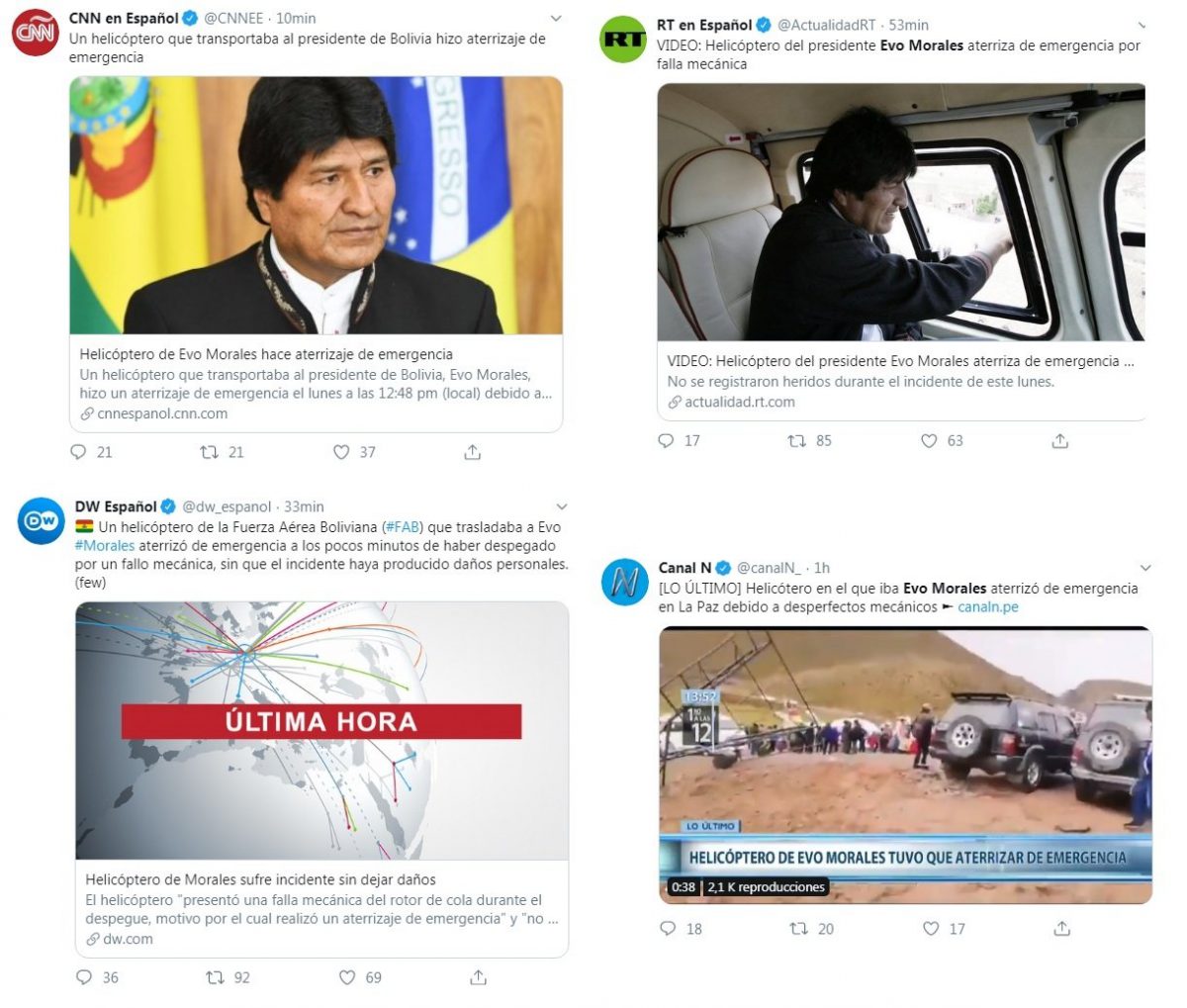Mientras que CNN en Español informó que «Un helicóptero que transportaba al presidente de Bolivia hizo aterrizaje de emergencia».