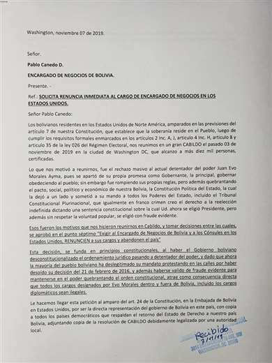 La periodista Carmen Osorio dio a conocer dos cartas que fueron entregadas a la Embajada de Bolivia en EEUU con las resoluciones del mencionado cabildo en el que participaron unas 10.000 personas. Allí, exigen la renuncia de estas dos autoridades por haber “quebrantado el pacto social, político y económico de Bolivia” y por incumplir el dictamen de “gobernar obedeciendo al pueblo y por someterse a la “reelección indefinida”.