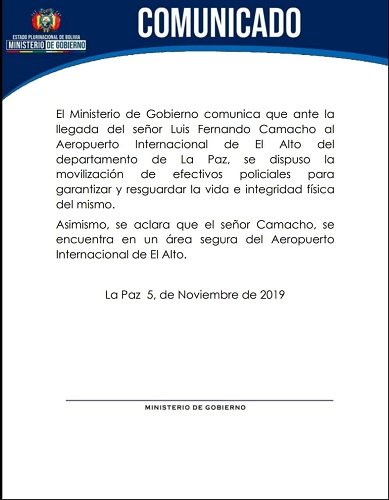 La Paz, urgentebo.- El Ministerio de Gobierno confirmó la mañana de este martes que Luis Fernando Camacho, presidente del Comité Cívico Pro Santa Cruz, se encuentra en un «área segura del aeropuerto internacional de El Alto», a donde llegó anoche a las 22.40 con el fin de entregar en la Casa Grande del Pueblo una carta de renuncia para que la suscriba el presidente Evo Morales.»Asimismo se aclara que el señor Camacho se encuentra en un área segura del aeropuerto internacional El Alto», dice el comunicado escueto del Ministro dirigido por Carlos Romero.