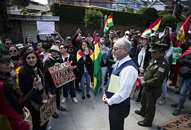 La mañana de este viernes un grupo de personas llegó a protestar a puertas del edificio donde la Organización de Estados Americanos (OEA) tiene sus oficinas, en la zona sur de la ciudad de La Paz.