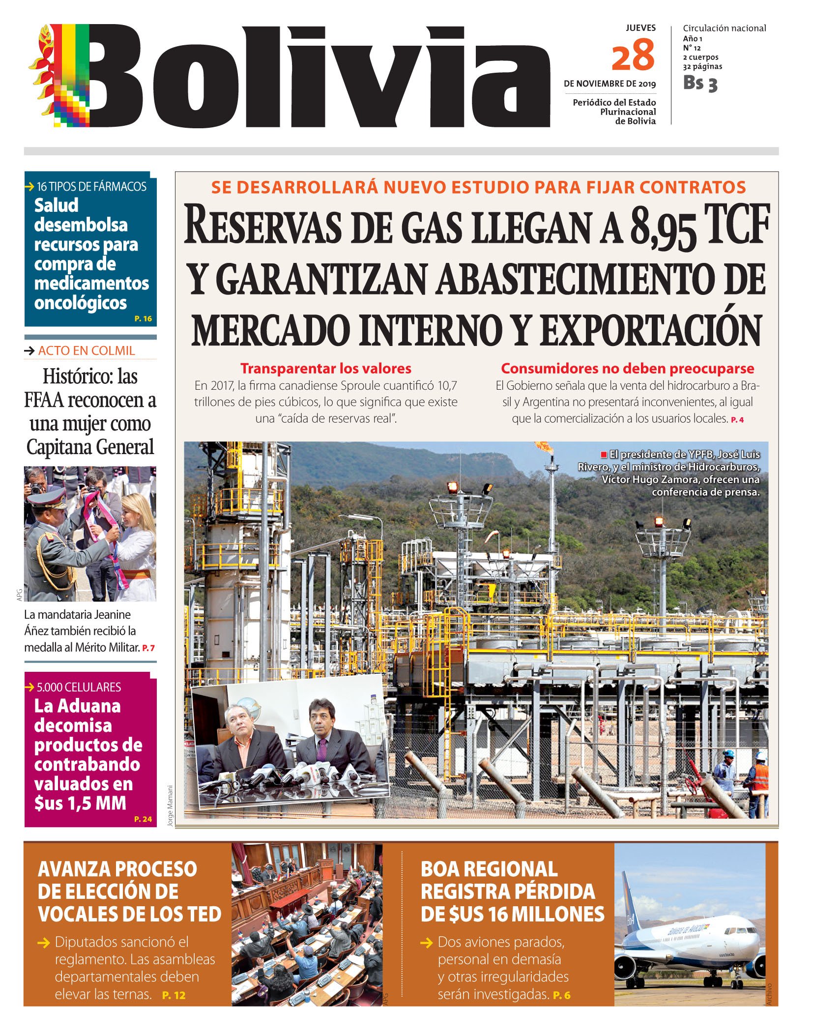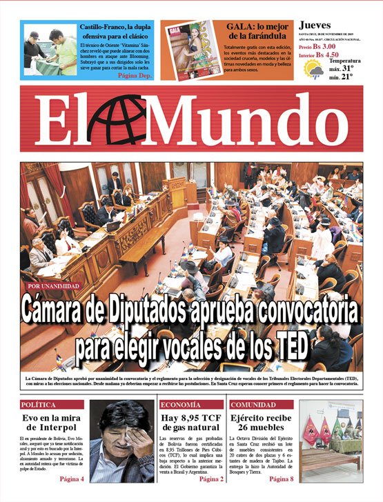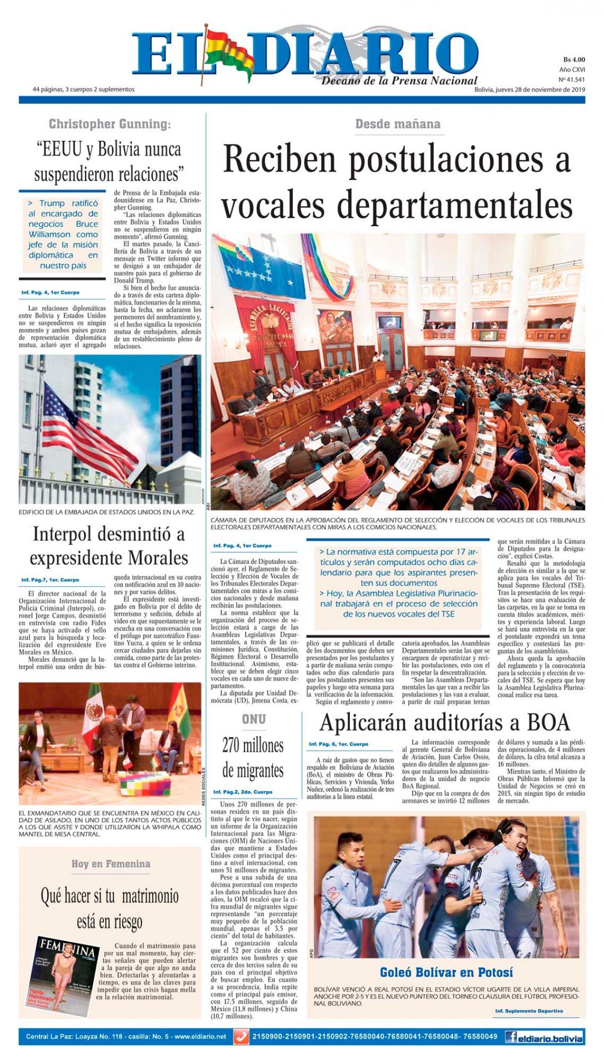 Edición 28-11-2019Portada Edición ImpresaPortada de la edición impresa del jueves 28 de noviembre de 2019El Deber – Los Tiempos – El Día – La Razón – Cambio – El Diario – Página Siete – Opinión