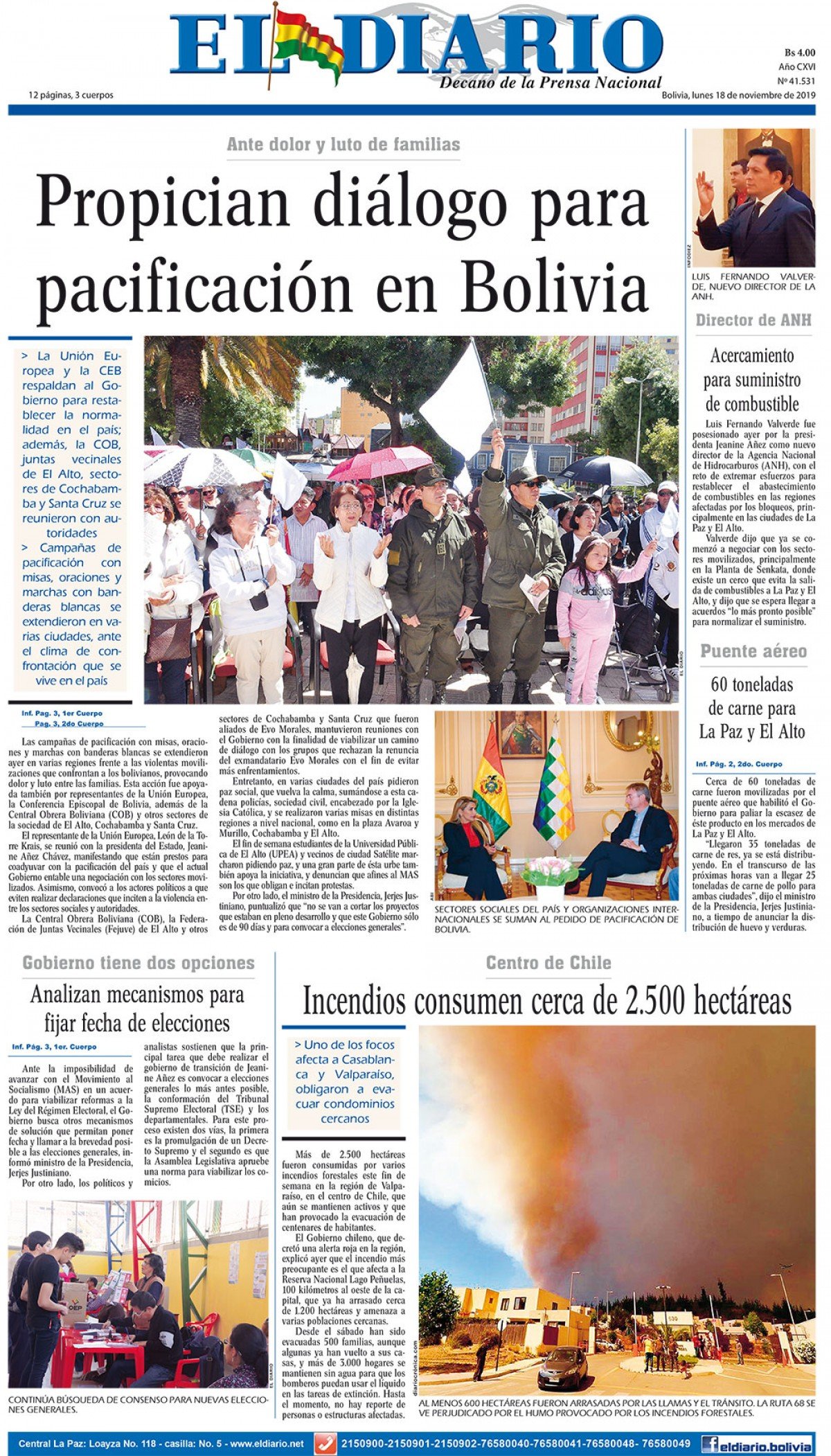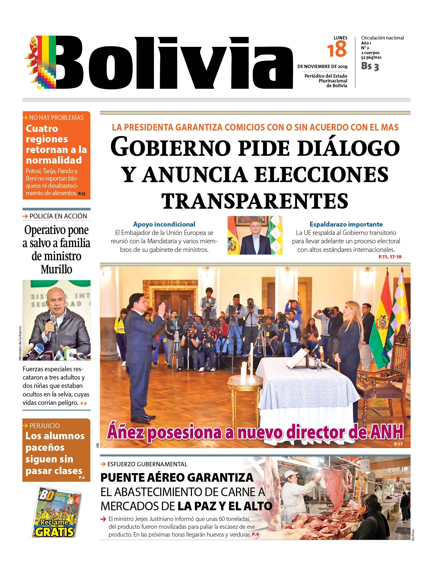 Portadas de periódicos de Bolivia del lunes 18 de noviembre de 2019