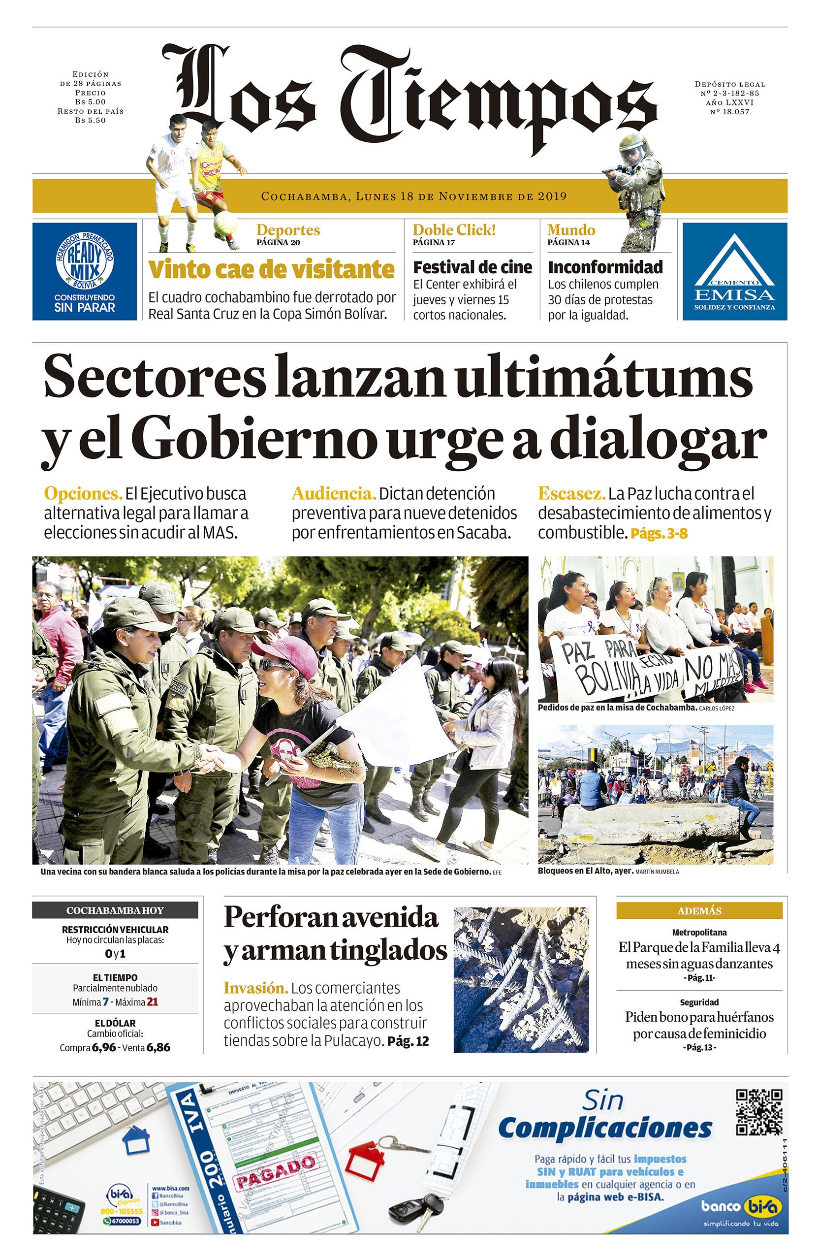 APERTURA EDICIÓN IMPRESAPortada Edición ImpresaEdición 18-11-2019El Deber – Los Tiempos – El Día – La Razón – Bolivia – El Diario – Página Siete – Opinión
