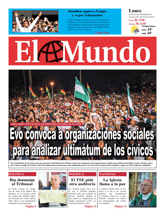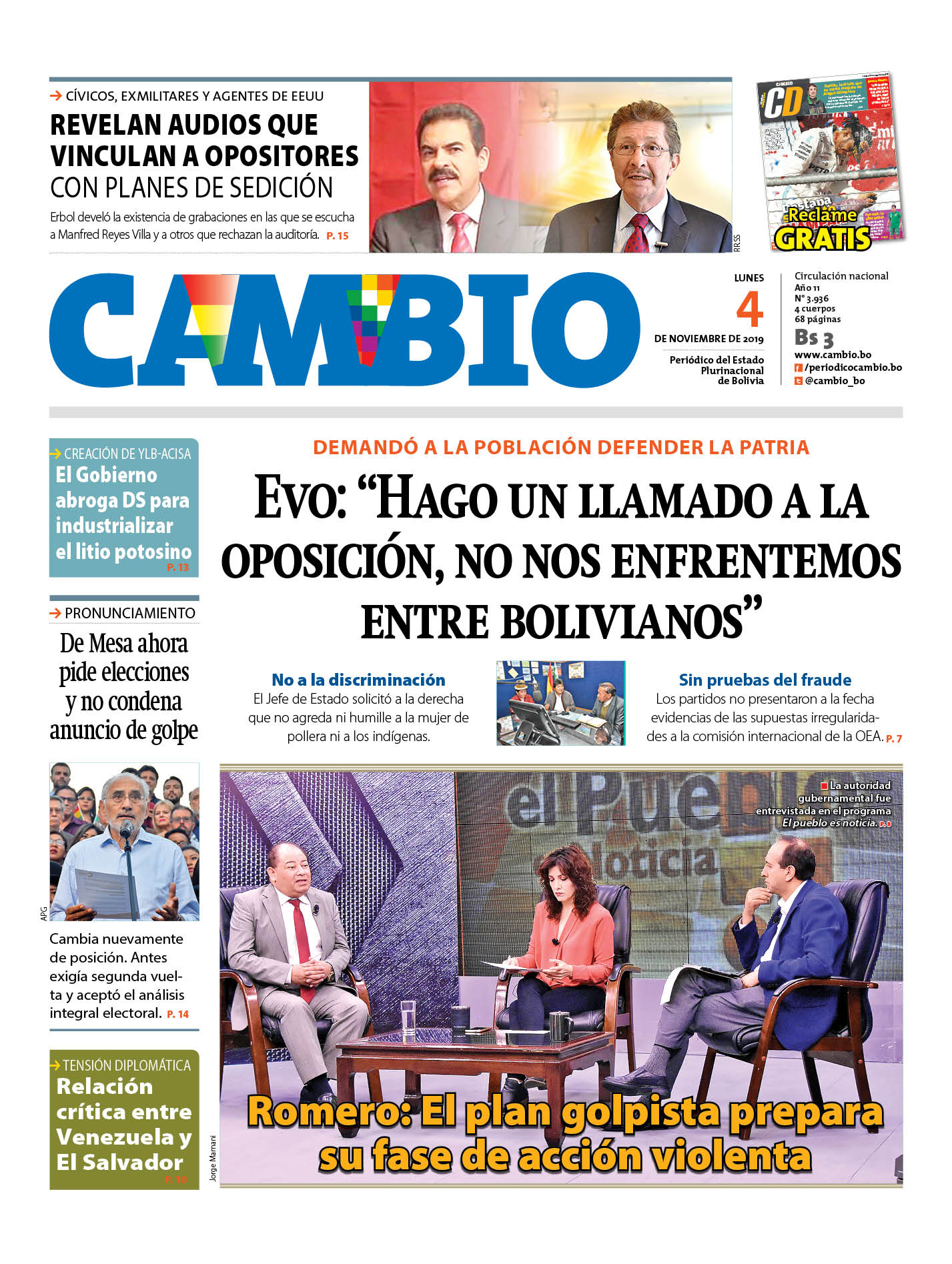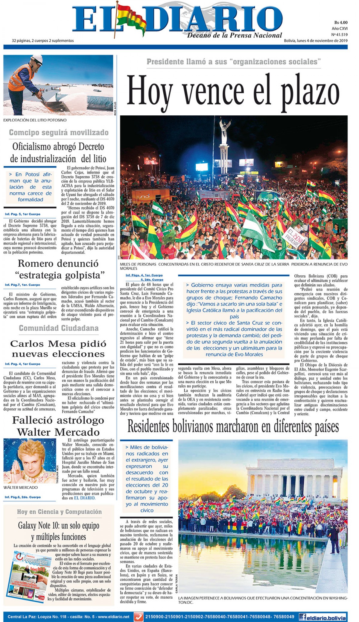 Portadas de periódicos de Bolivia del lunes 4 de noviembre de 2019Categorías MonitoreoEtiquetas , Portadas de periódicos 04/11/2019 El Deber – Los Tiempos – El Día – La Razón – Cambio – El Diario – Página Siete – Opinión – El Alteño – Correo del Sur