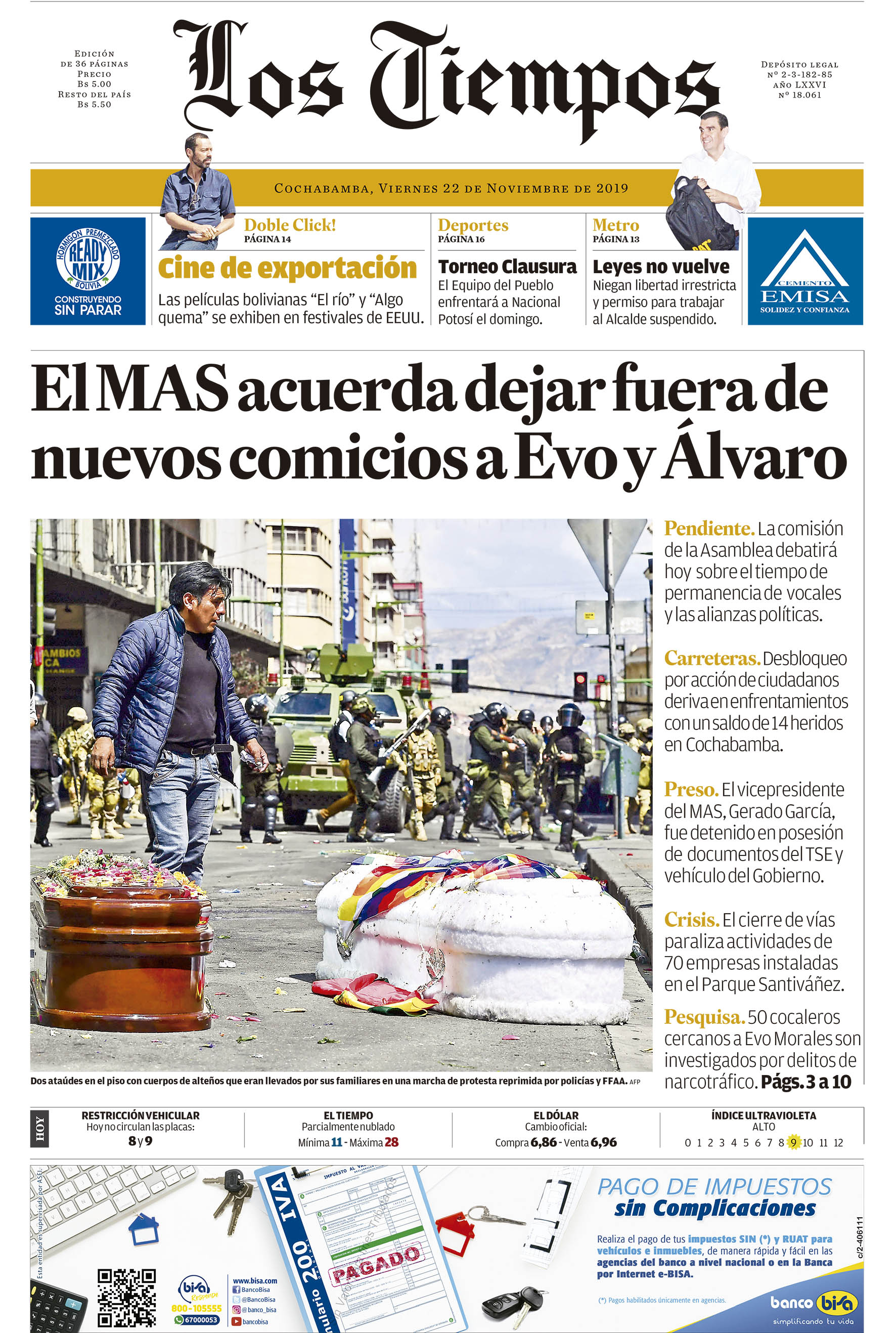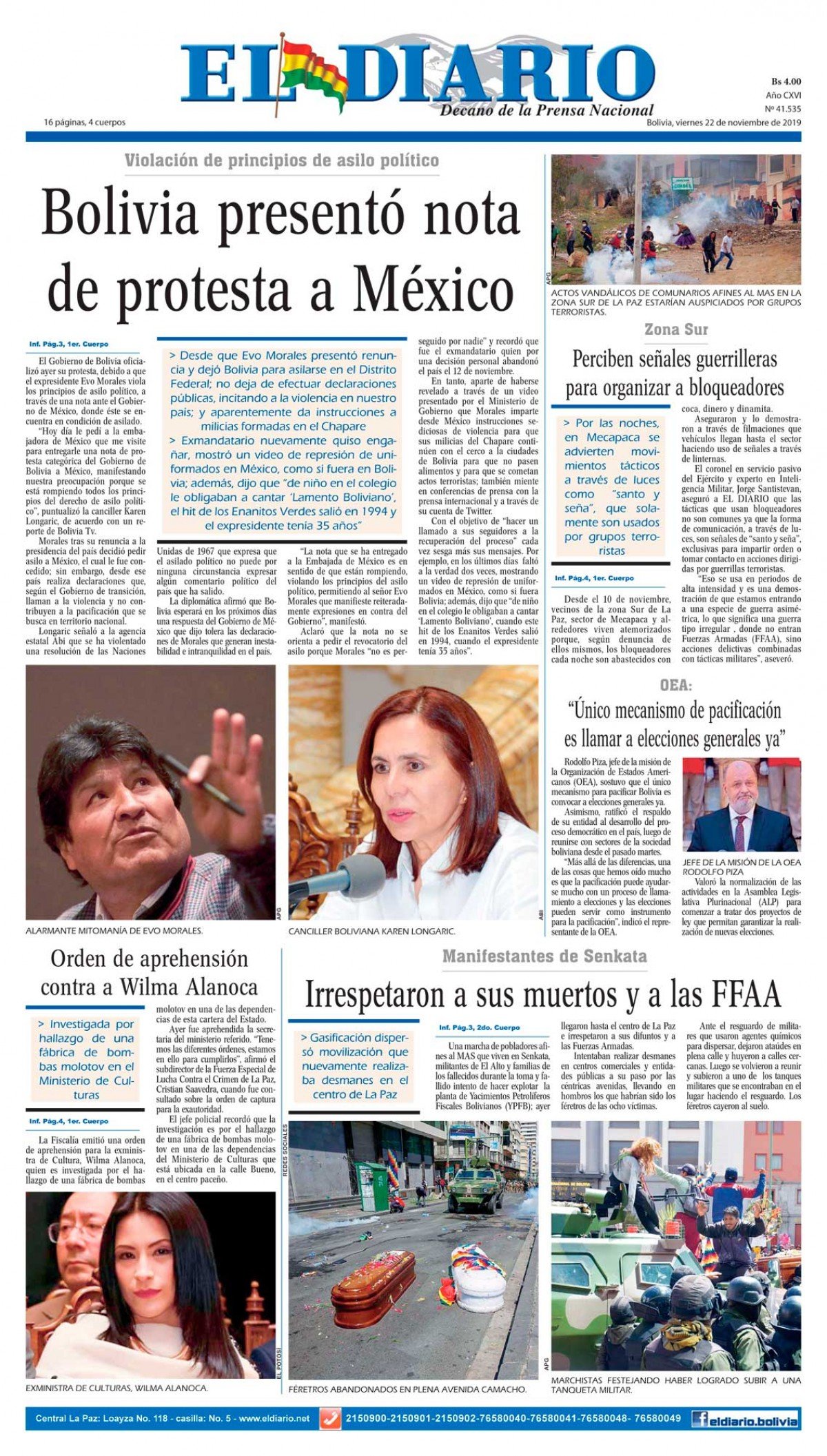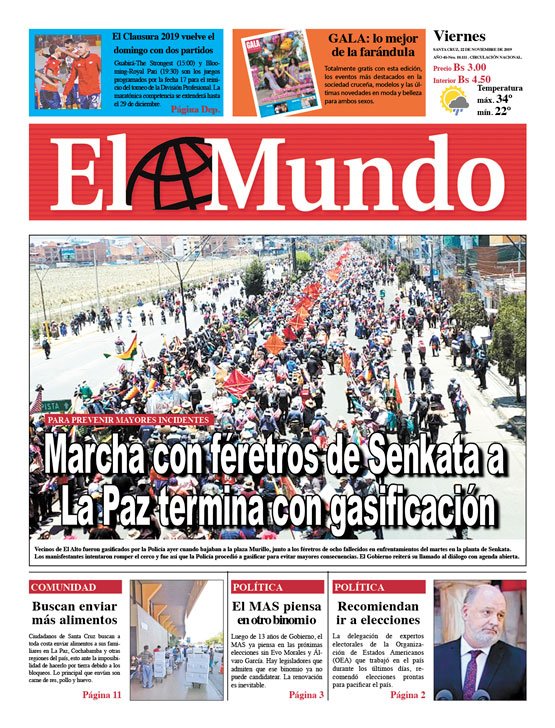 Portadas de periódicos de Bolivia del viernes 22 de noviembre de 2019Categorías MonitoreoEtiquetas , Portadas de periódicos 22/11/2019 El Deber – Los Tiempos – El Día – La Razón – Cambio – El Diario – Página Siete – Opinión – La Estrella del Oriente – El Mundo
