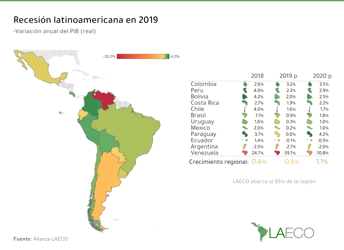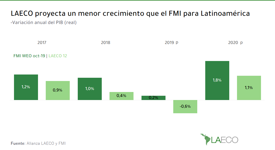 El indicador LAECO 12 se ve afectado por el sensible deterioro económico de Venezuela. Aislando la evolución de este país, el crecimiento regional alcanzaría un ritmo de 0,6% en 2019 y de 1,4% en 2020. La Alianza Latinoamericana de Consultoras Económicas expresa su solidaridad y apoyo para la resolución de los problemas que persisten en Venezuela, así como también los más recientes conflictos en otros países de la región, que abarcaron rupturas del orden institucional vigente.