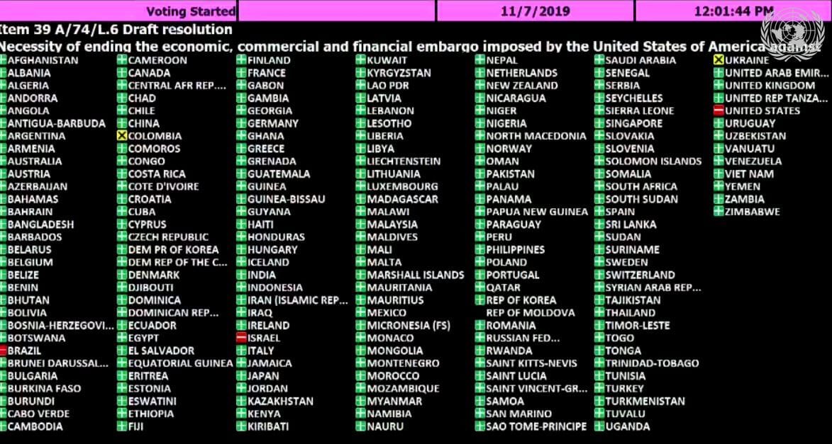 Saludamos la nueva victoria de Cuba, la número 28 desde 1992, en la #ONU contra el bloqueo económico, comercial y financiero impuesto unilateralmente por EEUU como represalia a su liberación del imperialismo. 187 países del mundo rechazan ese atentado contra el pueblo cubano. https://t.co/KkEY8yjTAU