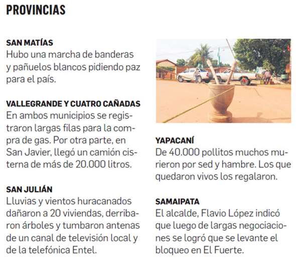 El mercado también muestra movimiento. Quienes no llegan a los centros de abastecimiento (por ejemplo, el de la zona del obelisco del Plan 3.000 que mostró el movimiento y caos vehicular característico de los días sin paro), aprovechan de acudir a las tiendas de barrio o camiones de empresas que distribuyen alimentos, que venden a precio de costo, como en la zona del sexto anillo y La Colorada.Pese a esta rutina, en los puntos de bloqueo la gente sigue de pie. Quienes ‘hacen guardia’ ante cualquier eventualidad explican que se dividen en tres turnos por la zona de San Aurelio y que se organizan a través de un grupo de WhatsApp para atender necesidades entre vecinos (alimentos y gas, las más comunes).Incluso la organización para almorzar en comunidad en las calles también crece. Un poco más lejos, en el barrio Magisterio Sur del Distrito 12, las mujeres madrugan para comprar insumos para la olla del barrio. El menú es guiso de fideo y para que alcance se acompaña de arroz.