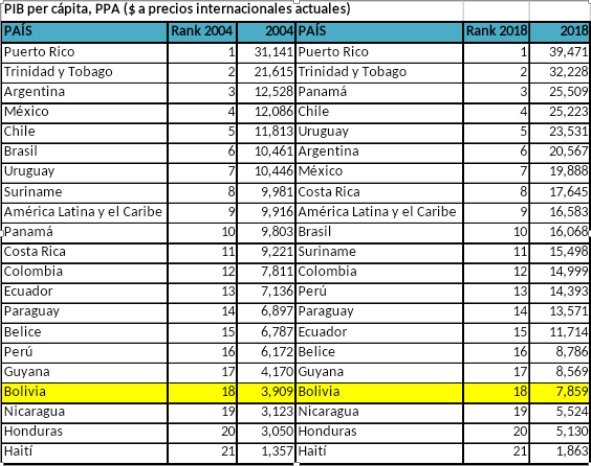 En el cuadro se ve que Bolivia el año 2004 tenía un indicador que alcanzaba a 3,909 dólares americanos, por persona y el 2018 alcanzó a 7,859 dólares (para poder comparar con los otros países este indicador sube su nivel o cuantía). Independientemente de las cantidades, resulta que Bolivia no cambió en el ranking manteniéndose en el puesto 17, y peor aún, si medimos la diferencia o la brecha entre el primero y Bolivia, resulta que el 2004 la diferencia era de 27,233 y el 2018 se amplió a 31,612 dólares, o sea, si bien no cambiamos de puesto, sí nos alejamos más del primero.